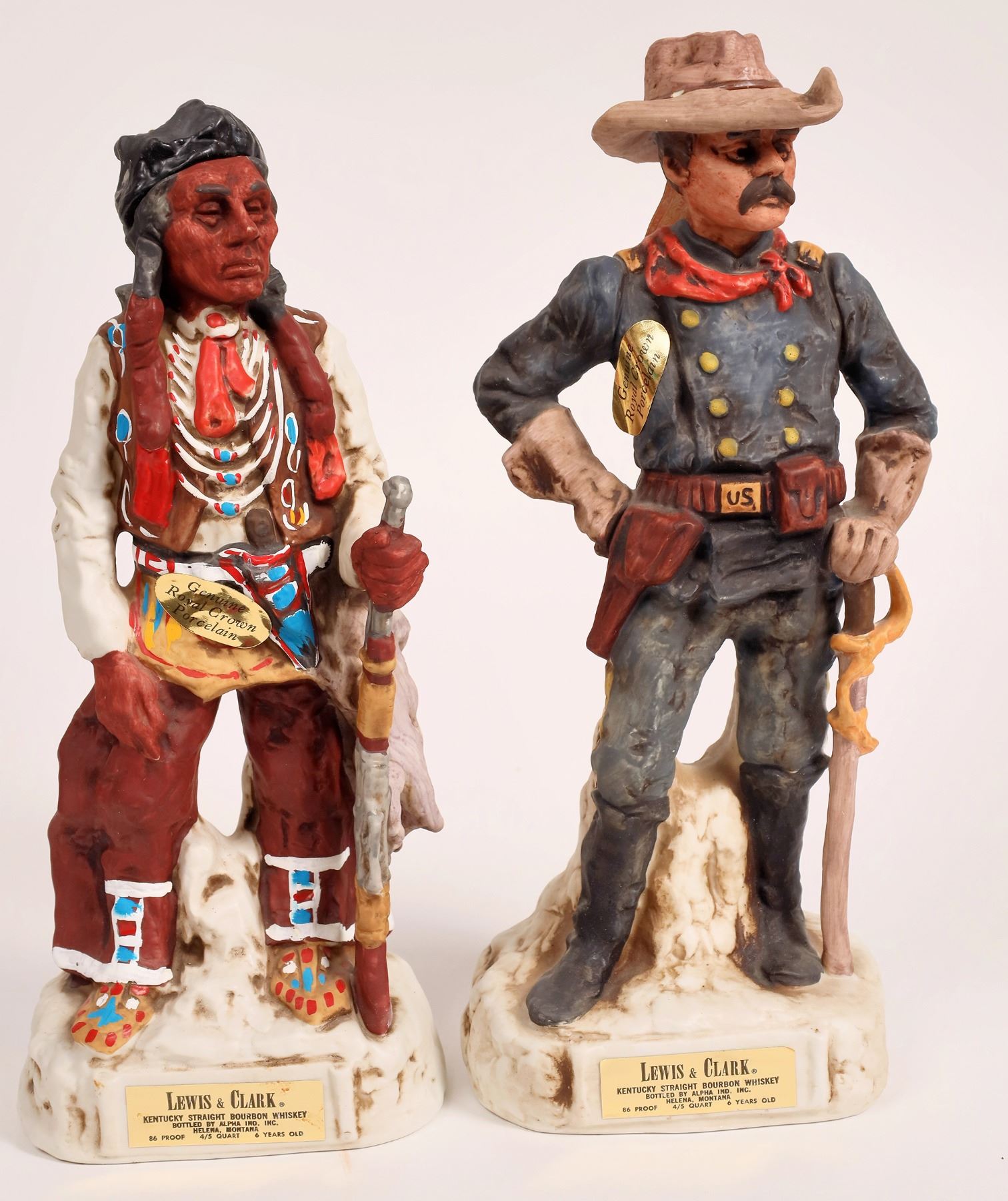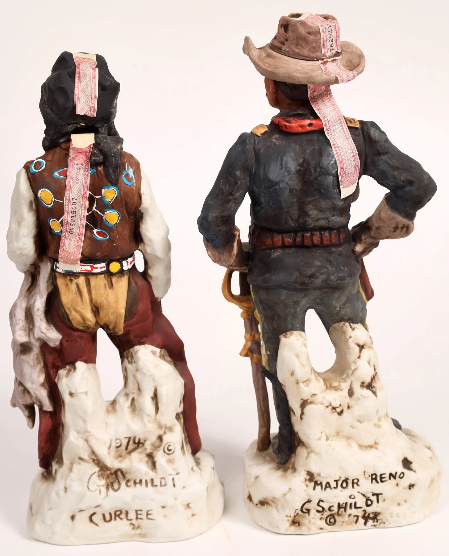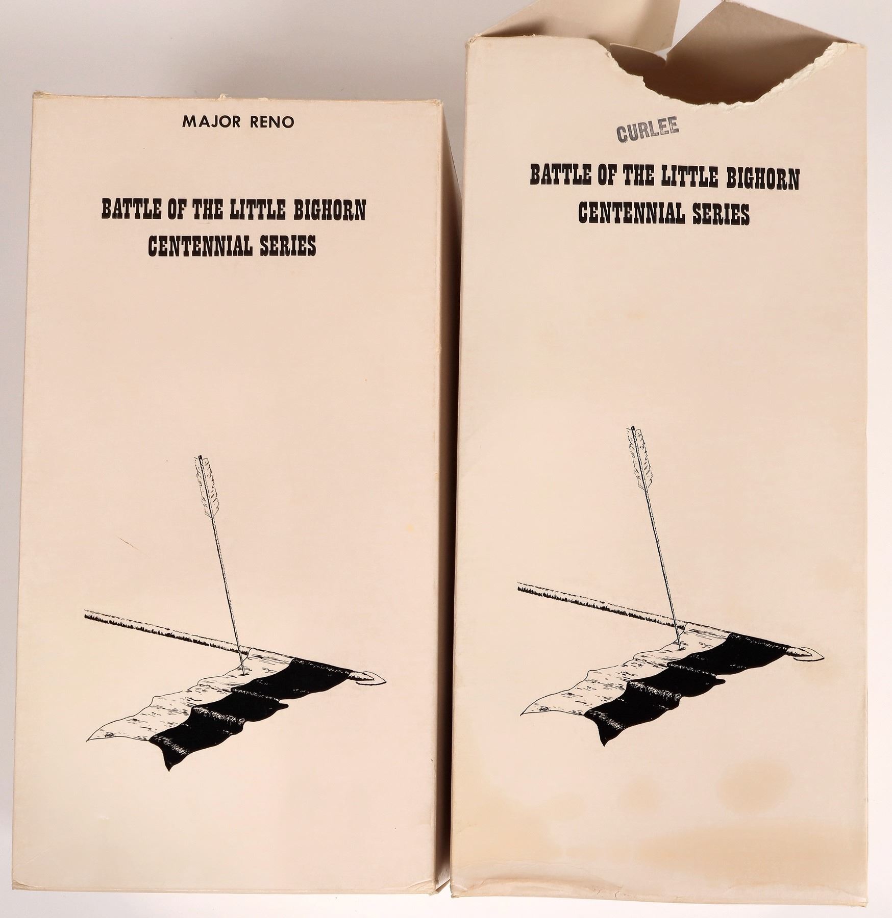 2 c.1974 empty 13" Centennial Series Battle of Little Bighorn decanters. Curlee in mostly intact box and Major Reno in original box. Sculpted by Gary Schildt.