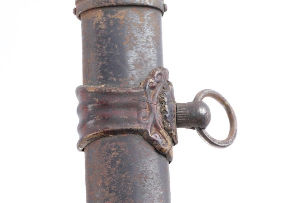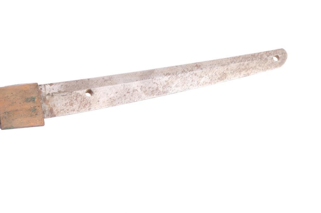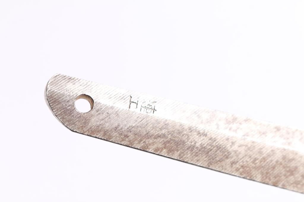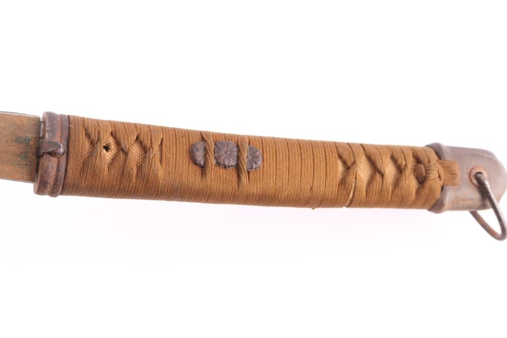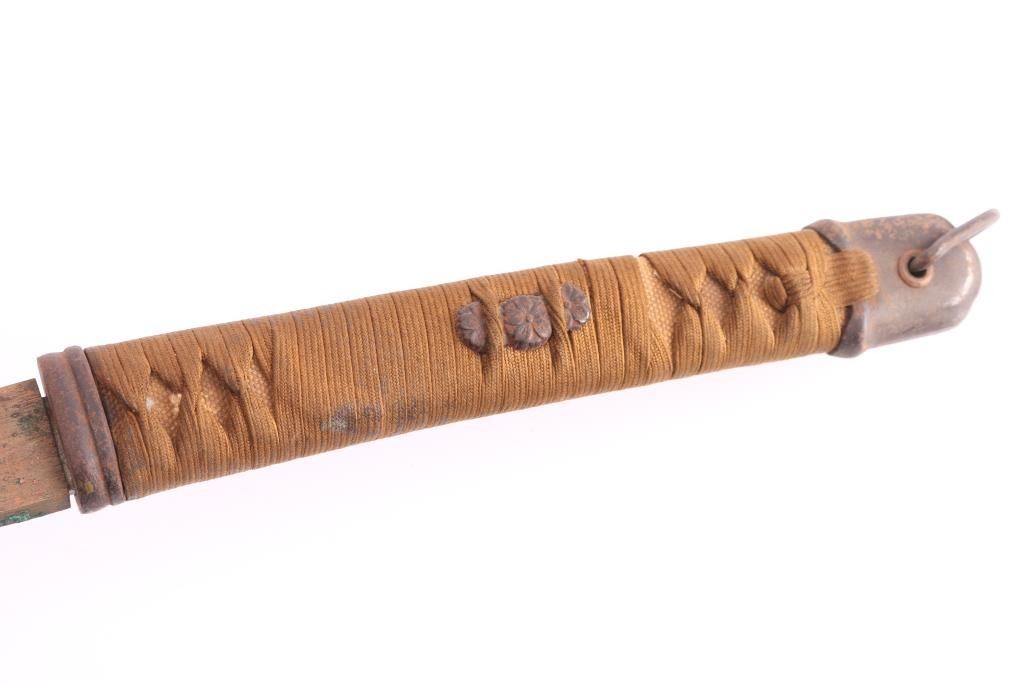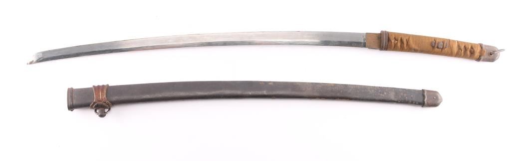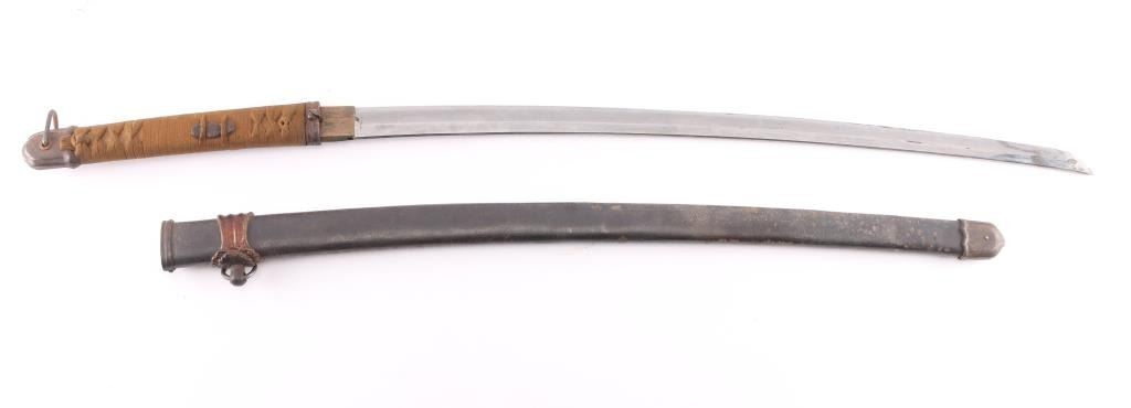Battlefield Pick-Up. Late war style mid grade Japanese officer Katana, with an arsenal-made blade. It is in the standard 1944 pattern fittings, offically known as Rinji Seikishi or "Special Contingency" version of the Type 98 Shin-Gunto setting, sometimes called the "Type 3". The katana itself measures 39 1/4 inches overall, with a 26 1/4 inch arsenal-made blade. It has a standard bright finish to it, with a straight faux hamon (temper line). the two hole (Mekugi-ana) tang is marked with a two mei stamp, the flat of the tang is stamped "00" followed by a Mantesu Mune Su stamp indicating this sword was manufactured in 1944. The blade mountings are the typical Pattern 1944 era Army style, a copper habaki (blade collar), with an unadorned iron fuchi (grip collar) with spring lock (Bent). The tsuka (handle) has black painted copper Imperial Army cherry blossom menukis (grip decoration), and an unadorned black Kabuto-Gane (Pommel Cap). The Tsuka (handle) has an stingray (Sa-Me) grip panels, covered with complete brown Ito (cloth binding), which is in very good condition, but not wrapped traditionally, which is typical on the P1944 Setting. Single ring steel scabbard with wood insert, unadorned fittings. The sword is missing the tsuba and spacers, has been exposed to the elements for a time with the scabbard and metal fittings showing surface rust and finish loss. The blade is overall bright with patches of dark pitting at the tip. No doubt this sword was picked up on one of the islands by a USGI some time after the action.