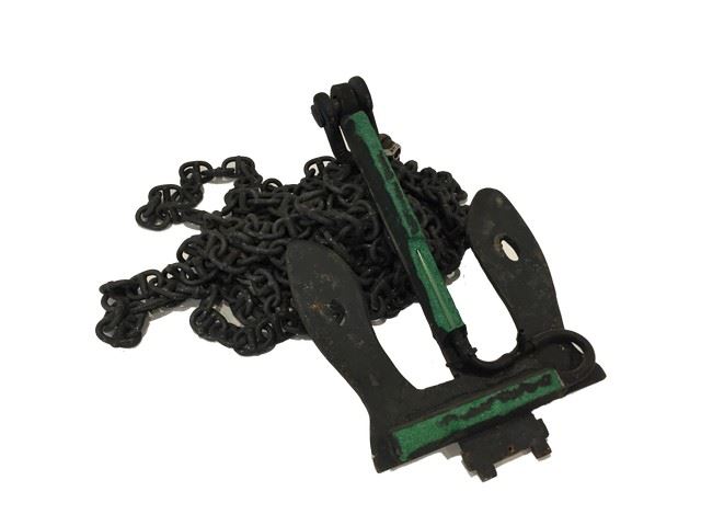 Battleship - Torpedo machined out of aluminum and used as a element buck for underwater shots. Inside is a pressure chamber that was filled with air and thinned-out white tempera paint that would shoot out of finely machined holes in the aft end, spinning the dual screw props and propelling the torpedo down fine wires. From New Deal Studios (12"x7" on the anchor) (chain: 24" long x 3" diameter)
