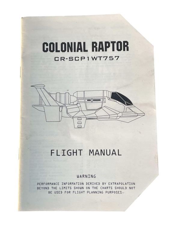 Original flight manual for a Colonial Raptor used in the science fiction television series 'Battlestar Galactica' (2004 - 2009) where, when an old enemy, the Cylons, resurface and obliterate the 12 colonies, the crew of the aged Galactica protect a small civilian fleet - the last of humanity - as they journey toward the fabled 13th colony, Earth.