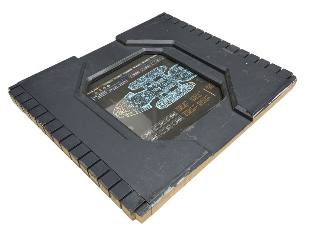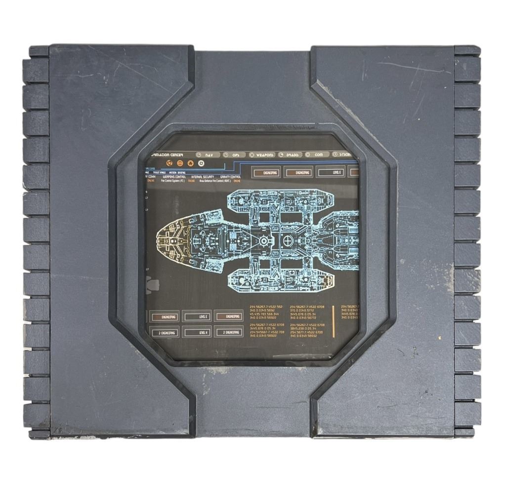 Original Galactica bridge CIC control panel used in the science fiction television series 'Battlestar Galactica' (2004 - 2009) where, when an old enemy, the Cylons, resurface and obliterate the 12 colonies, the crew of the aged Galactica protect a small civilian fleet - the last of humanity - as they journey toward the fabled 13th colony, Earth.