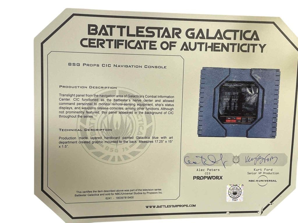 Original translight panel from the CIC navigation area of Galactica's combat imformation center used in Galactica's corrridors in the science fiction television series 'Battlestar Galactica' (2004 - 2009) where, when an old enemy, the Cylons, resurface and obliterate the 12 colonies, the crew of the aged Galactica protect a small civilian fleet - the last of humanity - as they journey toward the fabled 13th colony, Earth.