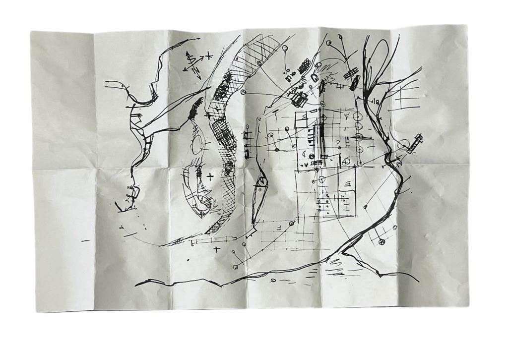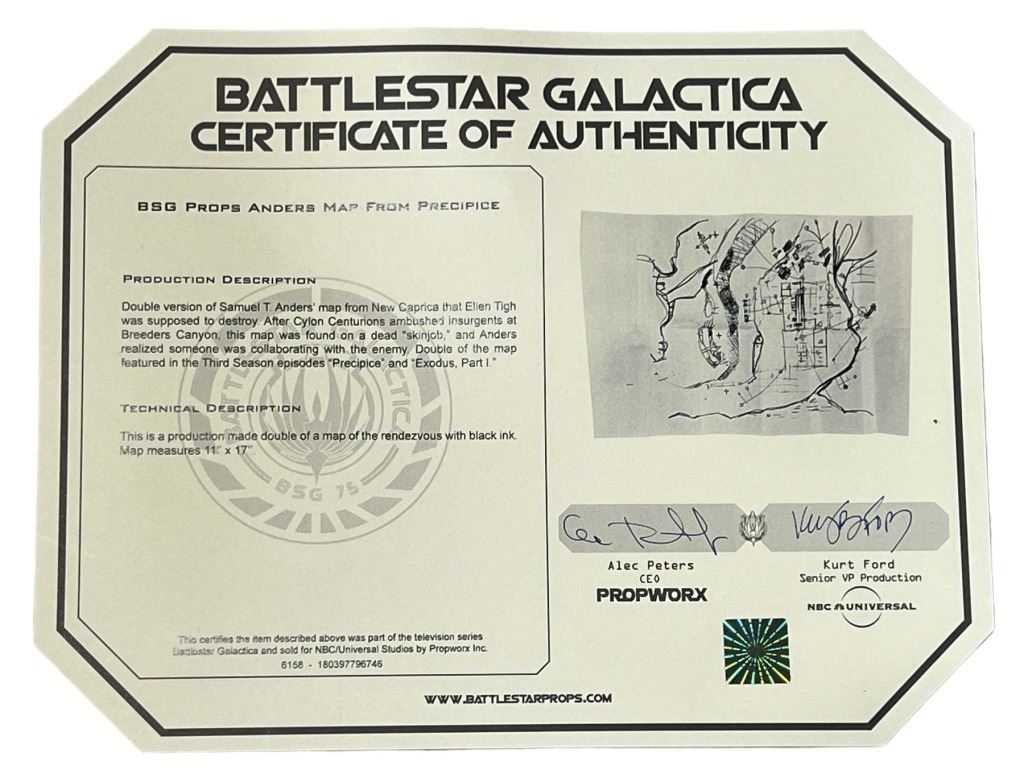 Original Samuel Anders rendezvous map used in the science fiction television series 'Battlestar Galactica' (2004 - 2009) where, when an old enemy, the Cylons, resurface and obliterate the 12 colonies, the crew of the aged Galactica protect a small civilian fleet - the last of humanity - as they journey toward the fabled 13th colony, Earth.