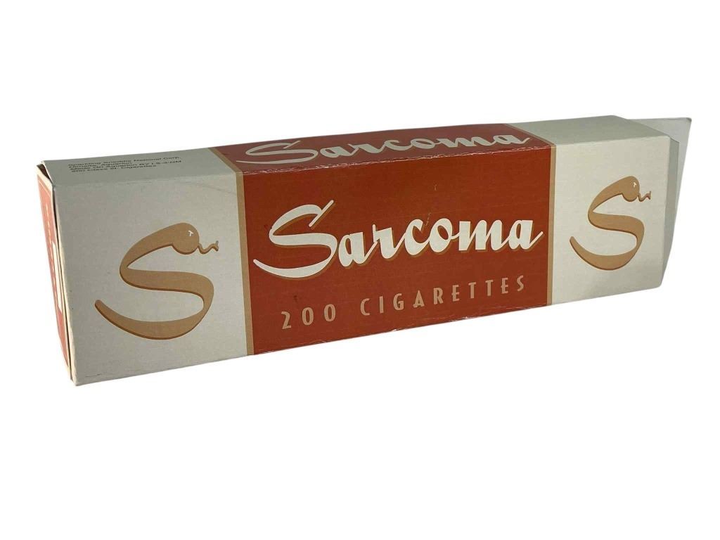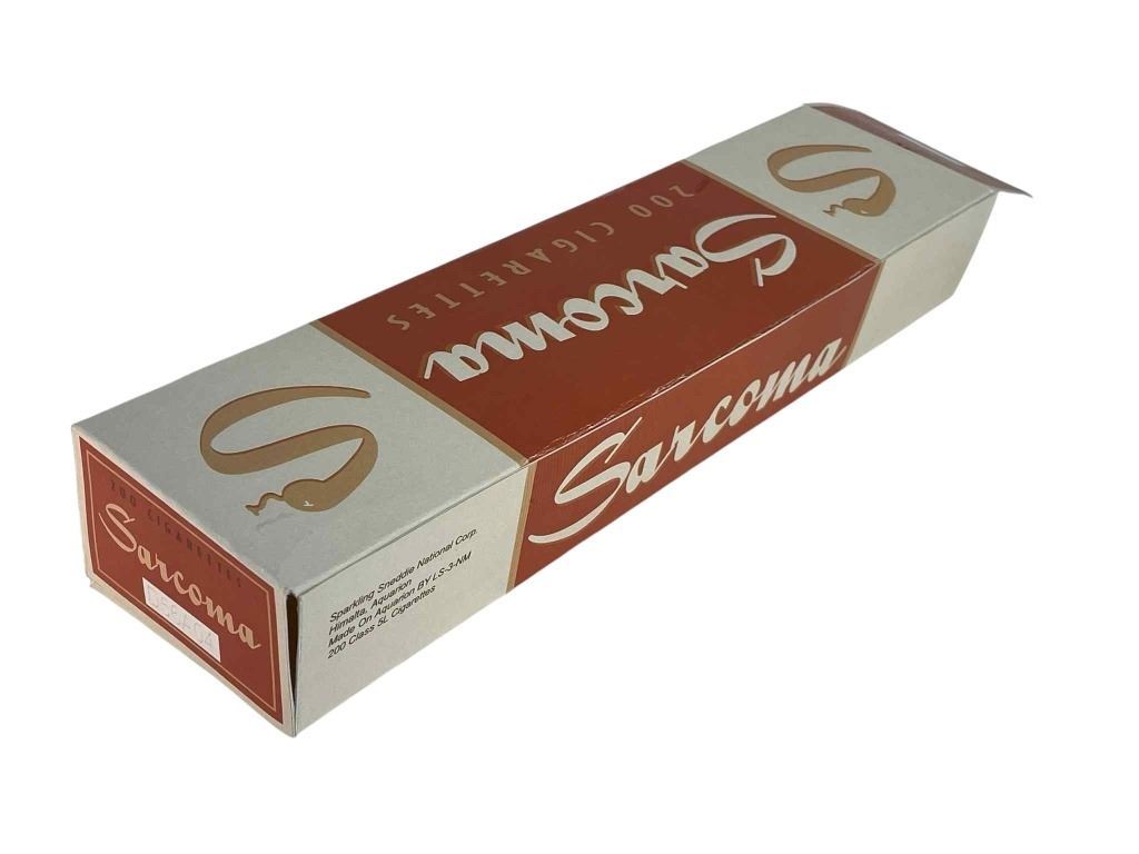 Original Sarcoma 200 cigarette box (Empty) used in the production of the science fiction television series 'Battlestar Galactica' (2004–2009) where, when an old enemy, the Cylons, resurface and obliterate the 12 colonies, the crew of the aged Galactica protect a small civilian fleet - the last of humanity - as they journey toward the fabled 13th colony, Earth.