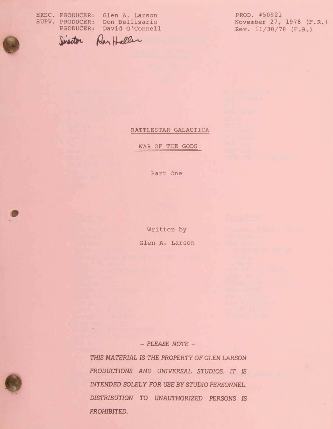 155. Battlestar Galactica and Galactica 80 (5) episode and TV-movie shooting scripts.(Universal, 1978-1980) Vintage (5) original shooting scripts for episodes and TV-film specials from the Battlestar Galactica franchise. Includes "War of the Gods" Parts I and II, "Ultimate Weapon" [plus call sheets, shooting schedules, and cast & crew list], "Saga of a Star World" [plus call sheets], and Spaceball". None were issued with cardstock covers, and all are presumed complete except "Saga of a Star World", which ends on page 185 without completion. Comprised of white, pink, green and blue correction pages. All show signs of on-set handling and use, plus occasional notations, good to very good condition. $200 - $300