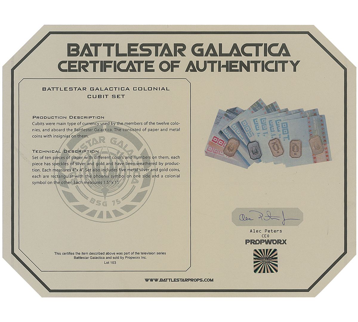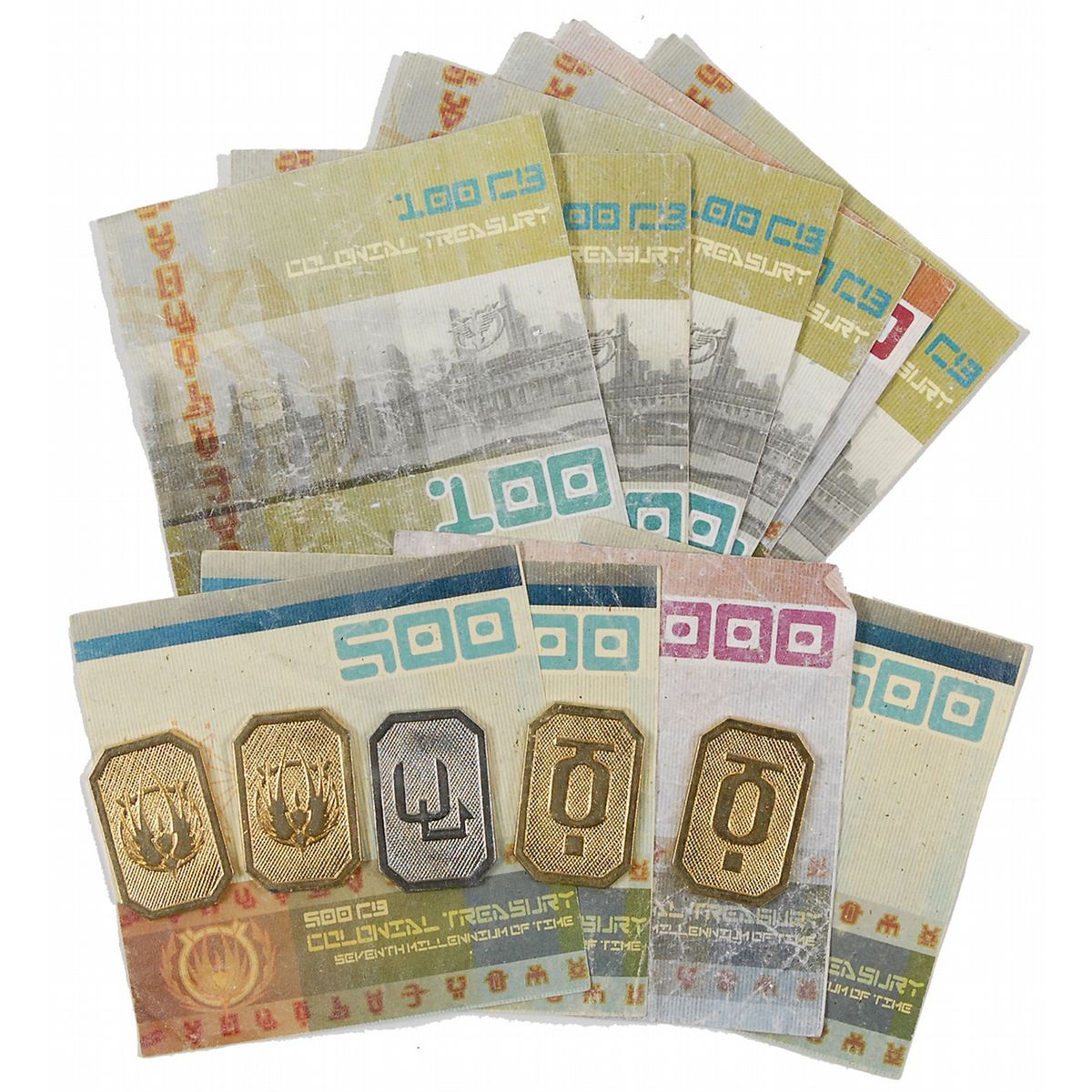 Collection of 15 pieces of Colonial cubits, both paper and metallic, made for the Battlestar Galactica television series, used as currency by members of the 12 colonies and on board the Battlestar Galactica. Set consists of ten pieces of paper currency, each measuring 4 x 4, in 100, 500, and 1000 denominations, and five metal silver and gold coins, each measuring 1.5 x 1, with a phoenix symbol on one side and a Colonial symbol on the other. In fine condition, with expected intentional wear and weathering to paper currency. Accompanied by a certificate of authenticity from Propworx.