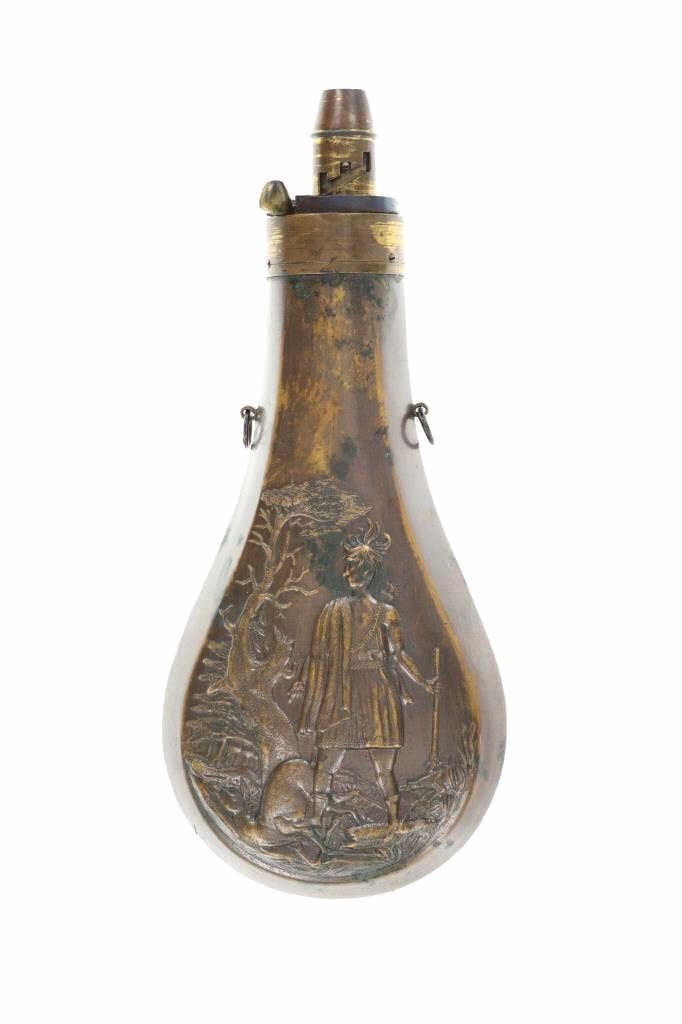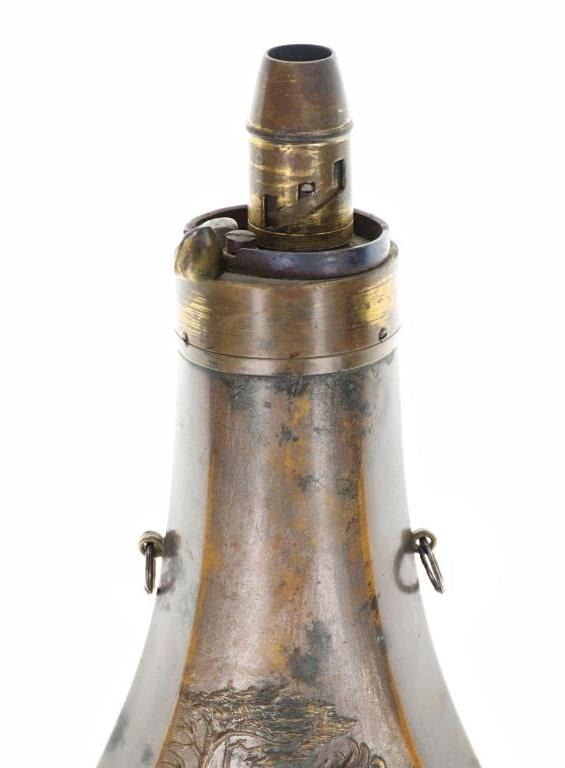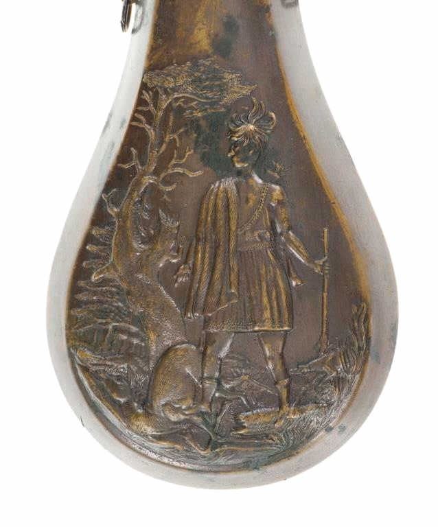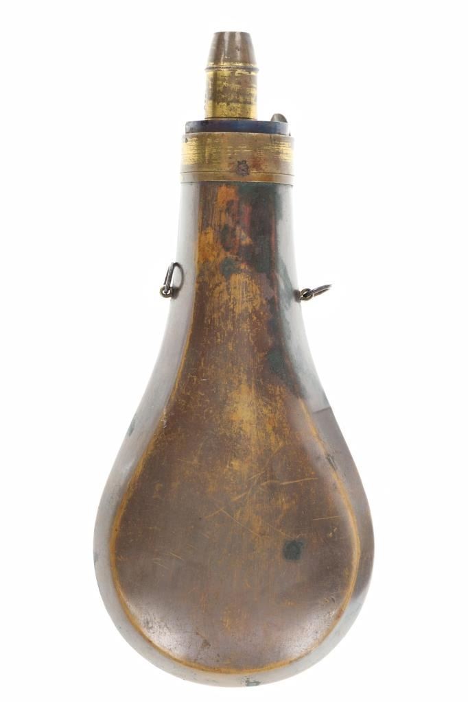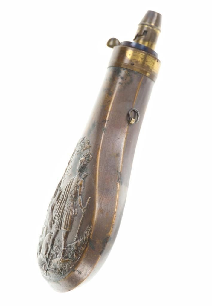 For your consideration is this Batty Brothers powder flask with a powder output measuring nozzle circa 1847-1858. In the 1800s, The Batty Brothers was a firm that provided the US government with powder flasks. Immigrants from Sheffield, England, Joseph H. and John T. Batty created the renowned business. The United States government hired a number of private businesses, including The Batty Brothers, to produce powder flasks for the armed forces. New England, the nation's most industrialized region at the time, was where the Batty Brothers were located. The flask shows an image of a man standing over a deer he has just hunted. He is holding a rifle and has a powder flask slung around his waist as he looks down at the deer. In the background is a large tree and the hunters dog, low to the ground. The adjustable output measuring nozzle is marked on the side reading, "Batty". The nozzle can be adjusted to three different outputs or drams, usually from 3 1/4 to 2 1/2. The output nozzle and spring loaded cover are in good working condition. The powder flask shows a nice patina from its age and use over the years, showing signs of wear but no signs of major damage is noted. The powder flask measures 7 7/8" L x 3 5/16" W x 1 1/4" D and weighs 6 ounces.