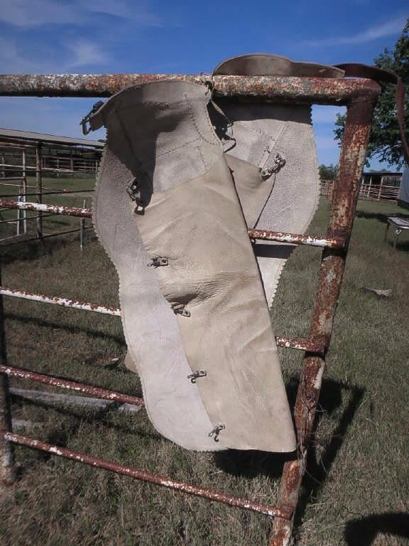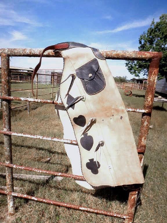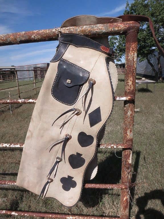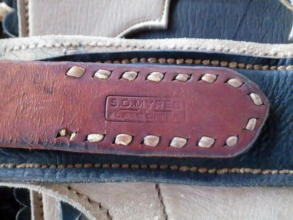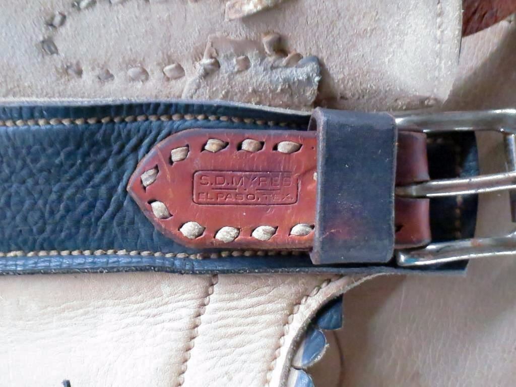 S.D. Myers of El Paso. These are of bone colored elkskin with dark elkskin card suit overlay, pockets and waistband. Buckstitched pockets and billets. These have been worn but they are clean and in supple condition. They were made for a big fellow.
