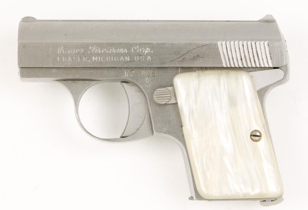 Single action semi auto pocket pistol with 2" barrel. Stainless steel, imitation pearl grips and fixed sights. Good bore and action. Includes 1 magazine. Condition: Good shoeing light scratching and cracks in the grip panels.
