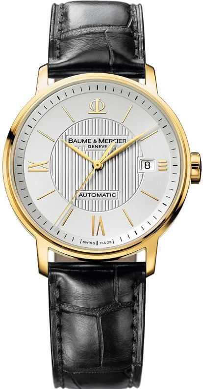 Model: 8787 - CASE = [Material:18kt Yellow Gold Polished], [Case Diameter:39], [Case Thickness:7.7mm], [Bezel:Fixed 18kt Yellow Gold], [Case Back:Solid], [Water Resistant:30 Meters - 100 Feet], [Crystal:Scratch Resistant Sapphire], DIAL = [Color:Silver], MOVEMENT = [Type:Automatic], [Crown:Push Down], BAND = [Clasp:Pin Buckle], [Type:Black Leather], (Usually ships in 1 to 2 weeks.)