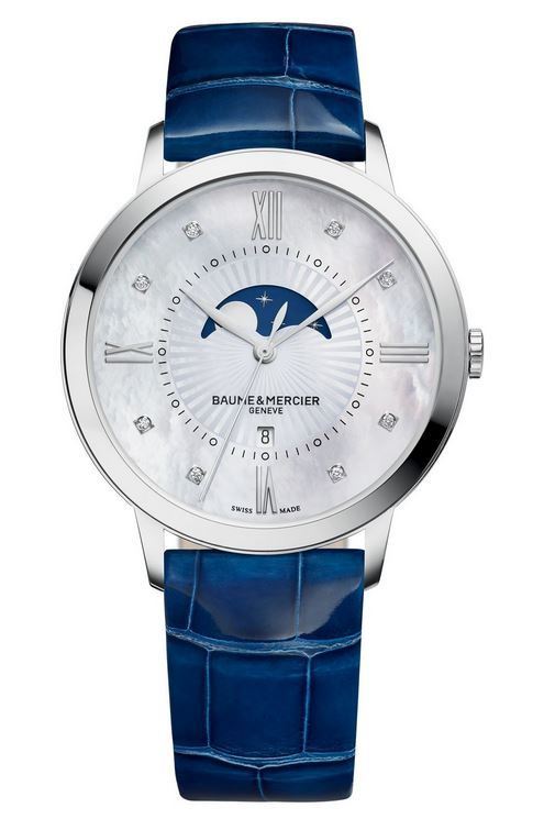 Model: 10226 - CASE = [Material:Stainless Steel], [Case Diameter:36.5], [Case Thickness:7.1mm], [Bezel:Fixed], [Case Back:Solid], [Water Resistant:50 Meters - 165 Feet], [Crystal:Scratch Resistant Sapphire], DIAL = [Color:Mother of Pearl with Diamonds], MOVEMENT = [Type:Quartz], BAND = [Clasp:Deployment], [Type:Blue Alligator Leather], (Usually ships in 1 to 2 weeks.)