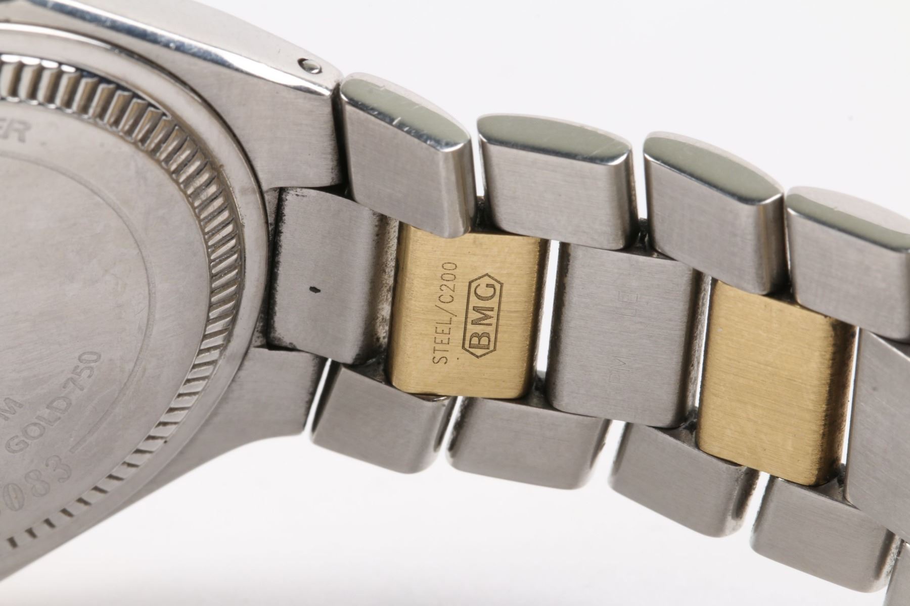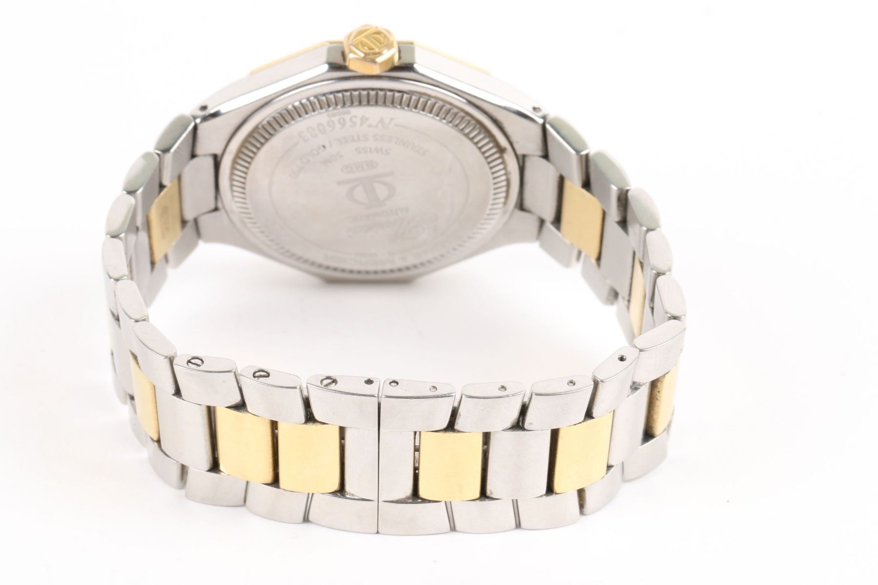 CIRCA: 2000s. CASE MATERIAL: Stainless Steel, 18K Yellow Gold. DIAL DIAMETER: 30mm. BRACELET MATERIAL: Stainless Steel, 18K Yellow Gold. MOVEMENT: Automatic. FEATURES: Date. WEIGHT: 114.7g. Est. $1200-1500 DISCLOSURE: Watches were running at time of photography unless otherwise stated. Service history is unknown unless paperwork is provided. We cannot guarantee accuracy of any of the watches offered. "