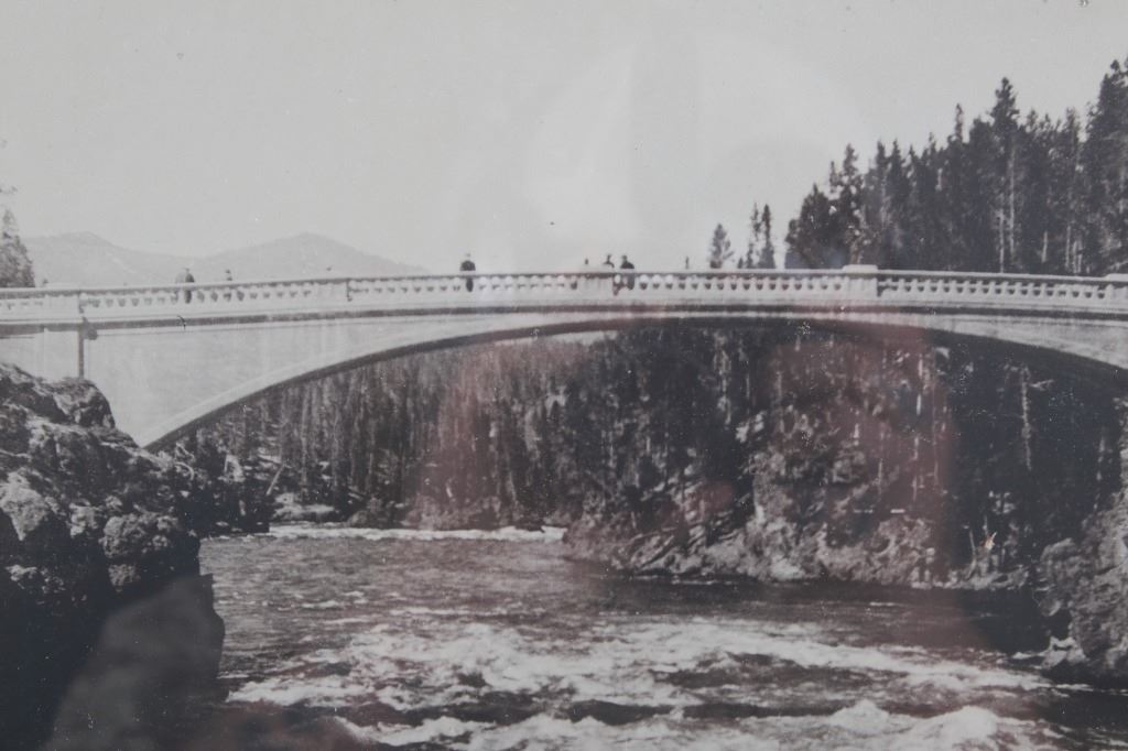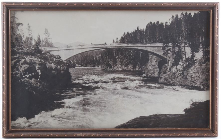 Included is a Baumgartner Studio original photograph of Canyon Bridge, aka Chittenden Bridge in Yellowstone National Park c. 1908. This photograph is of the rapids and original bridge which was designed and built by Hiram Chittenden, noted as a renowned historian of Yellowstone National Park and also was an Army Corps of Engineer officer in the park from 1891-1892 and 1899-1906 during which time he was in exclusive charge of the road work and general improvements, including the iconic basalt Roosevelt Arch at the northern entrance. The original bridge was the subject of many photographs and paintings before it was replaced in 1962. Notable is that the bridge was constructed in three days!