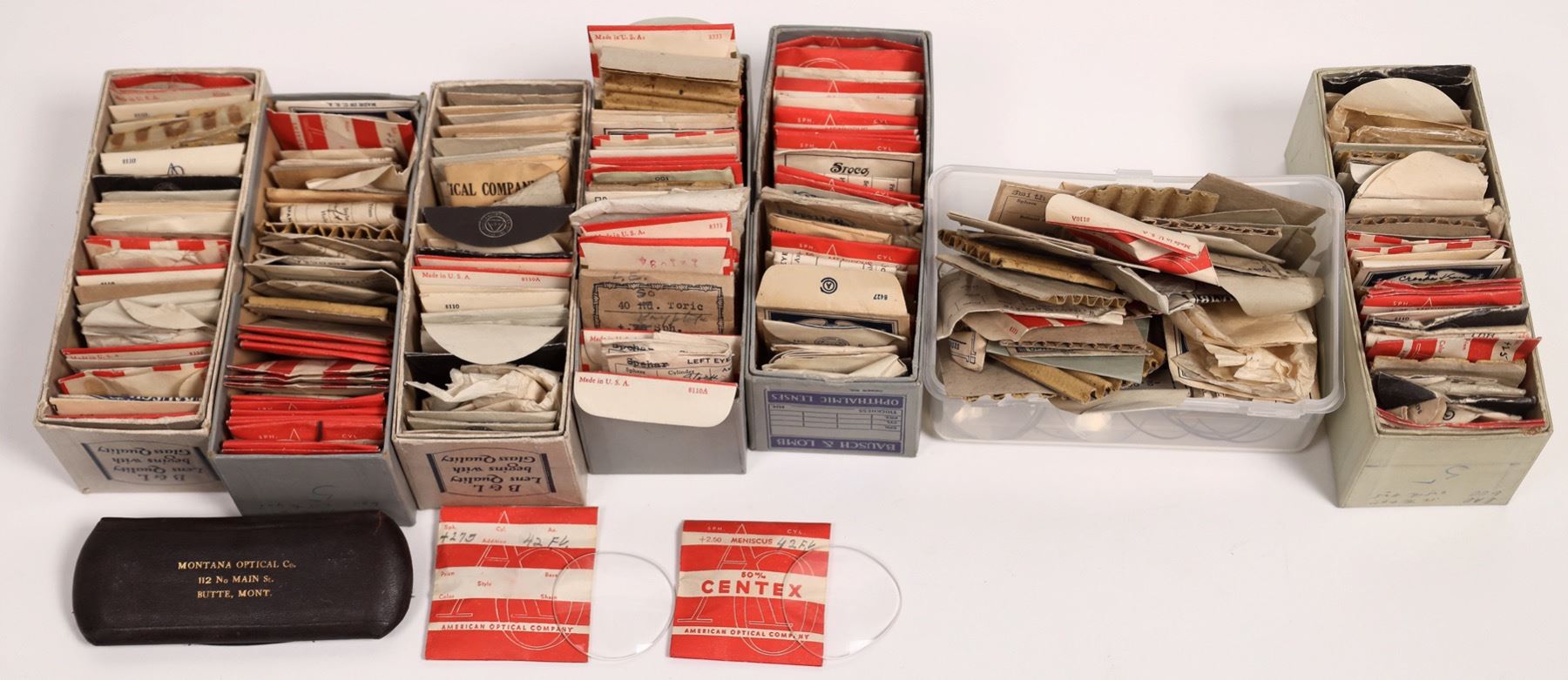About 120 Bausch& Lomb eye glass lenses in original sleeves and boxes. State: City: Date: Provenance: Stuart MacKenzie Montana Collection