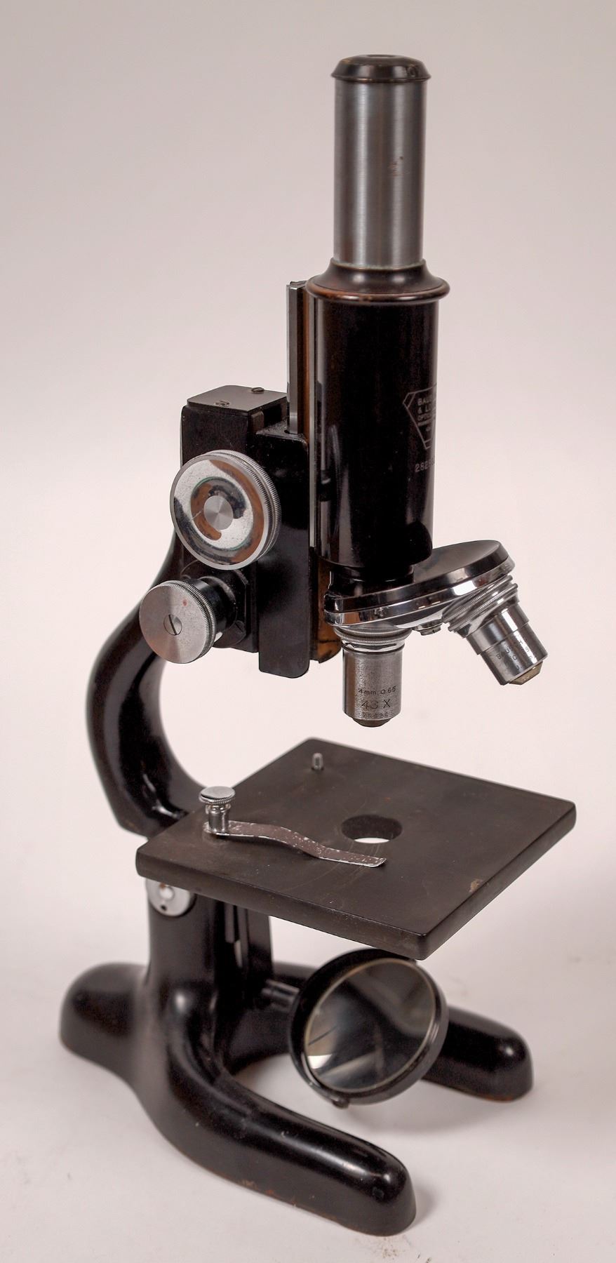 Bausch & Lomb microscope in original wooden case. Cast metal frame pivots at the base for easy viewing, 10x eyepiece, 4mm 43X objective, 16mm 10X objective, coarse rack focusing and fine focusing controls. Objective turret turns smoothly and locks in place firmly. One slide clip is missing. Concave mirror is intact. SN 282881. Bottom one inch of wooden case door is missing. This is a functional microscope for student use or a nice display piece.