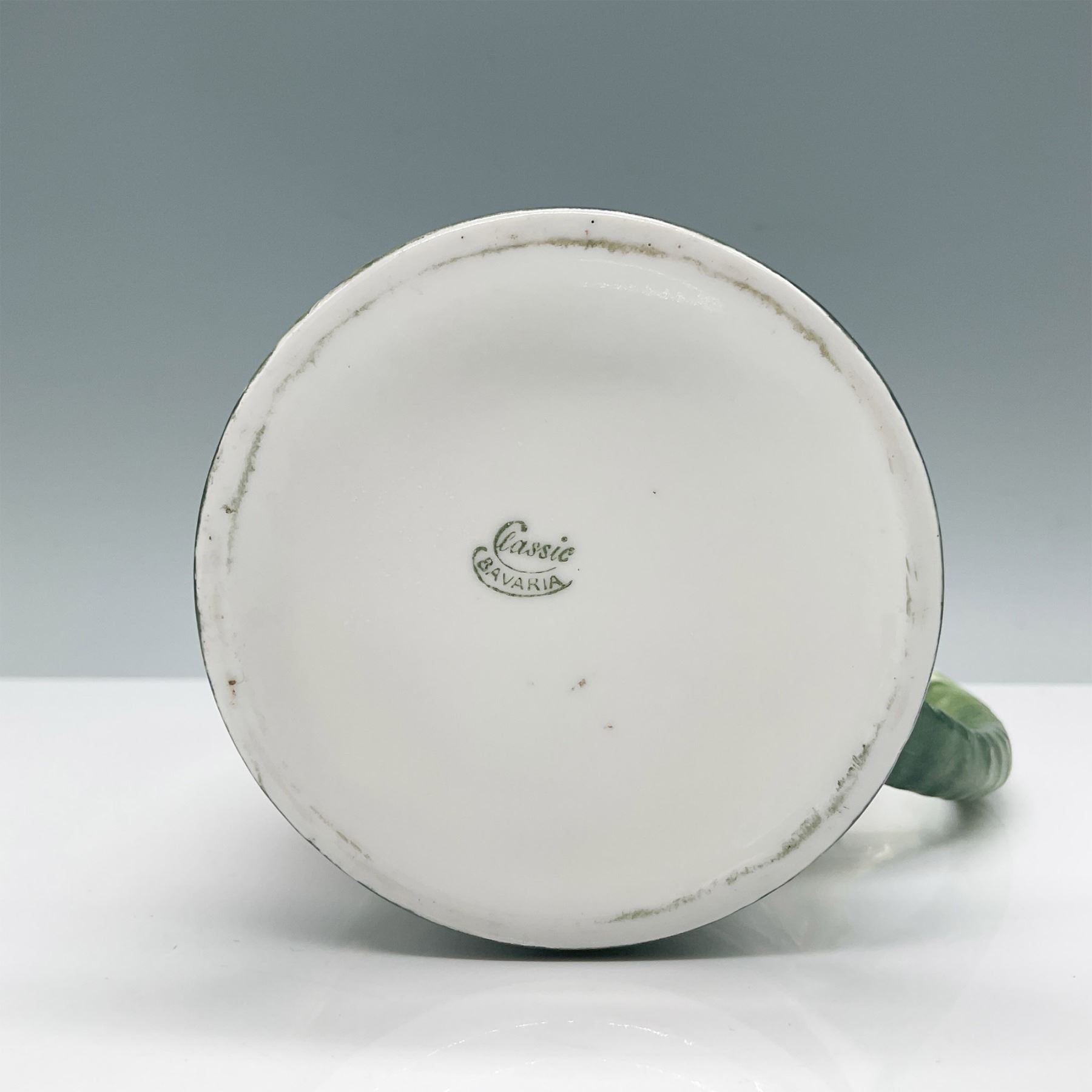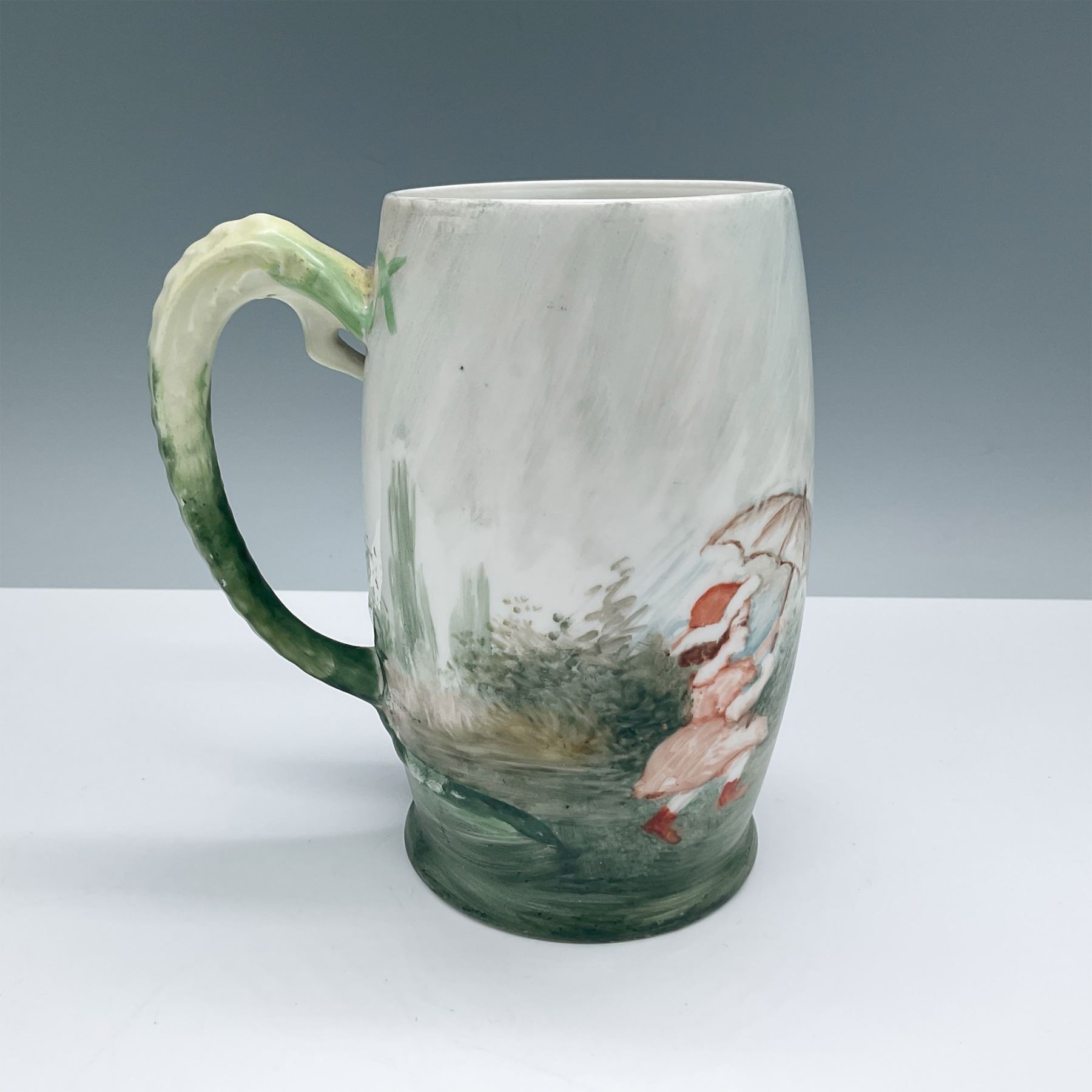 A Bavaria hand-painted beer stein featuring a unique dragon-shaped handle. The stein depicts a charming outdoor scene with child under an umbrella, surrounded by lush greenery. Marked "Classic Bavaria" on the base, this piece is a fine example of Bavarian craftsmanship. The stein measures 5.75"H, showcasing detailed artistry and a blend of functional design with decorative appeal. A wonderful collectible for stein enthusiasts or lovers of hand-painted ceramics.