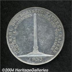 Bavaria. Ludwig I taler 1833 Commemorating the Monument for the Bavarians who lost their lives in the Russian Campaign, Bust right/Monument, Dav-570, KM404, AU with an obverse rim bump. Important notice: Heritage usually auctions material at the rate of 200-250 lots per hour. On some occasions eBay Live bid software or the Internet may not be able to keep up with the pace of the auction. We recommend placing a realistic absentee bid now as insurance to avoid disappointment. Occasionally the auctioneer may eliminate or reject an eBay Live bid, and the auctioneer may also reopen a lot after the close of the eBay live bidding (usually because we missed an audience bid), and may reject your bid even if it shows you as the winning bidder. By bidding via eBay Live, you agree that Heritage may award the lot to another bidder at its sole discretion under the circumstances described above or any other reasonable circumstances. Also please note that all Heritage lots purchased through eBay Live carry a 20% Buyer's Premium. Please make sure you read the Terms and Conditions before you bid.