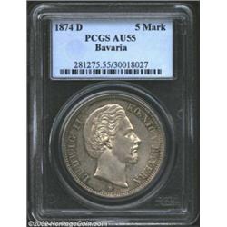 Bavaria. Ludwig II 5 Marks 1874D, KM502, AU55 PCGS. Lightly toned and a very scarce type in EF or better. Important notice: We expect to be auctioning lots at the rate of 200-250 per hour. Sometimes eBay Premier live bid software cannot keep up with that pace, so we strongly recommend that you place a realistic proxy bid now as insurance to avoid disappointment. Also please note that all Heritage/CAA lots purchased through eBay Premier carry a 20% Buyer's Premium. Please make sure you read the Terms and Conditions.