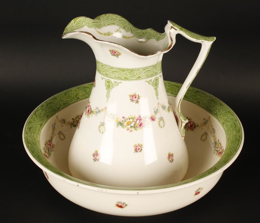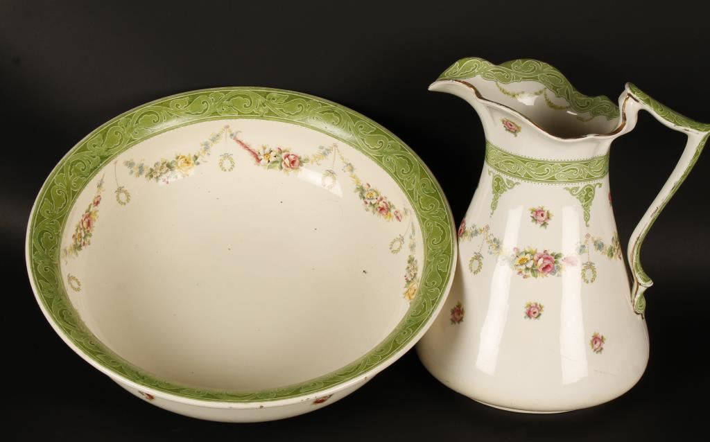 Rose motif trimmed in a lime green damask design. Marked on base "1667A". Overall good condition, shows age and use.