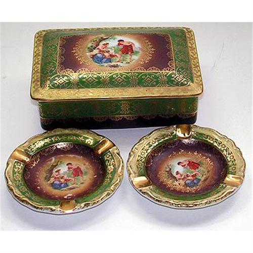 This set consists of a cigarette box and two ashtrays all with hand painted flirt scenes. Produced in Bavaria, from high quality porcelain, during the early 20th century. Each piece is marked BAVARIA and they are all in excellent condition.