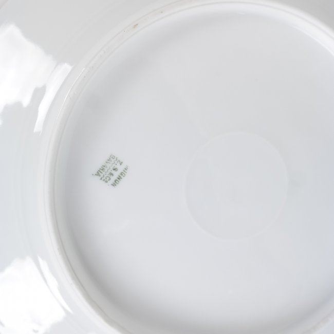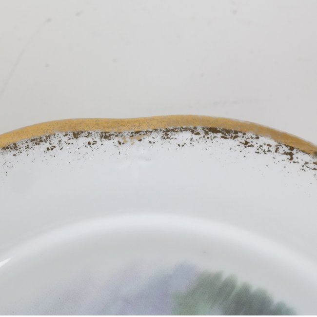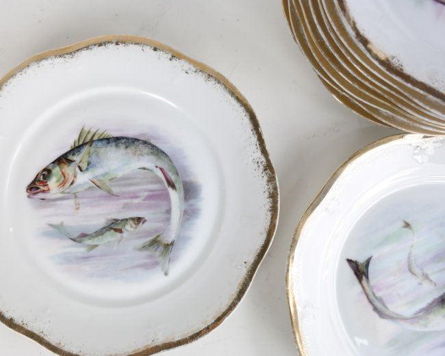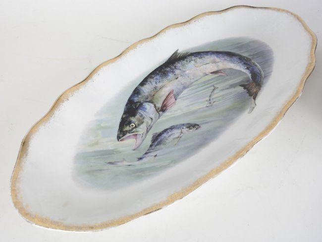 Bavarian printed porcelain fish service comprising serving platter and 10 plates, each printed with various fish and gilt borders. [Platter: 22 1/2"; Largest plate: 9 1/4" Dia]. Surface wear, one plate bears 1 1/2 hairline crack.