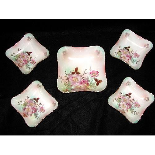 Bavarian fruit or dessert set is made by Carl Schumann 1881-1996 in Arzberg,Germany. This set placed at C.1900 with beautiful hand painted old roses in pink with antique cream background. Pale green and pink shading on interior of bowls and upper sides with gilt trimmed edges and interior leaf clusters. Marked on the back of each piece along with symbol and number. Set in excellent condition,no chips,cracks or fading. Large bowl measures 7L X 7W X 1.75H. Small bowls 5.l25L X 5.25W X 1.75H.