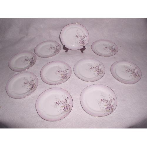 Set of 10 porcelain Bavarian dessert plates C.1885-90 hand painted with lavender edge,white background,deep purple floral,green brown leaves and white daises with yellow canters. The four scalloped edges are 24K gold. Raised floral design in lavender at each scallop with white raised semi circle below each. Every Austrian plate has the hand painted gold "C84" mark on the back. Excellent condition,no chips,nicks or cracks. Measure 6.5L X 6.5H.