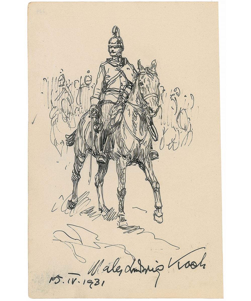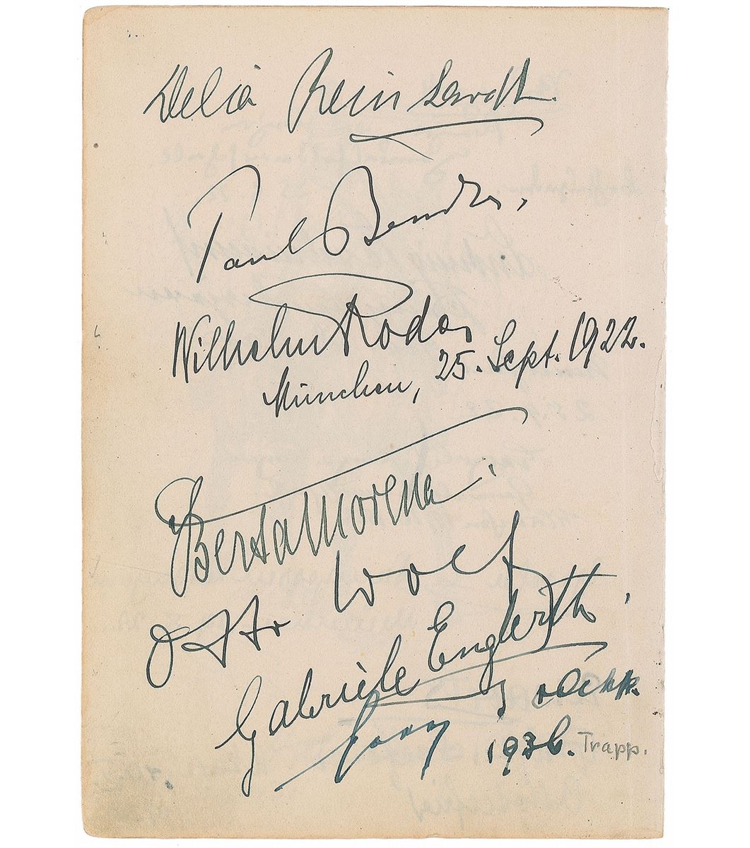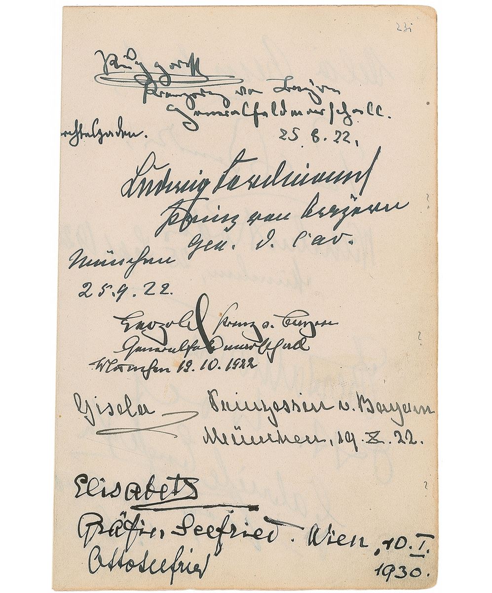 Unusual assemblage of ink signatures on adjoining off-white 4.5 x 7 album pages. Royal signatures of key figures in World War I include: Rupprecht, Crown Prince of Bavaria and commander of the Sixth Army in France during World War I; Ludwig Ferdinand, Prince of Bavaria and General of Cavalry; Leopold, Prince of Bavaria and General Field Marshal who replaced von Mackensen and captured Warsaw in World War I, earning the Pour le Merite; Gisela, Archduchess of Austria; and Elisabeth, Princess of Bavaria. Opera signers include: Delia Reinhard; Berta Morena; Gabriele Englerth; Paul Bender; Wilhelm Rode; Otto Wolf; and one other. The adjoining page bears an elaborate signed ink sketch of an officer on horseback dressed for combat by painter Ludwig Koch, “Maler [painter] Ludwig Koch, April 15, 1931.” In fine condition.