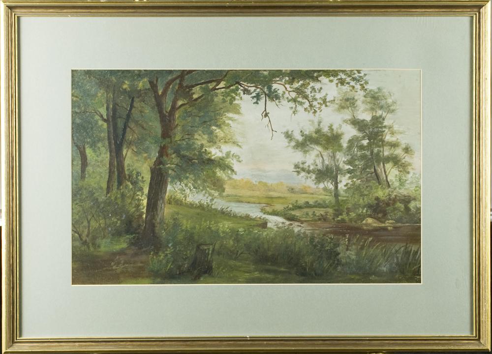 Depicting a forest interior scene. 13.5" H x 21.75" W (sight), matted and framed behind glass. Artist name written en verso. 20th Century.