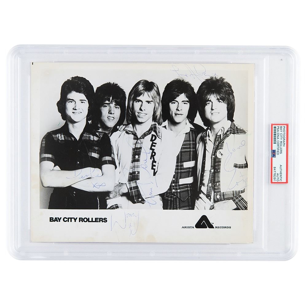 Glossy 10 x 8 Arista Records publicity photo of the Bay City Rollers, signed in blue ballpoint by Eric, Derek, Woody, Alan and Les. In very good to fine condition, with scattered light creases and stains. Encapsulated in a PSA/DNA authentication holder.