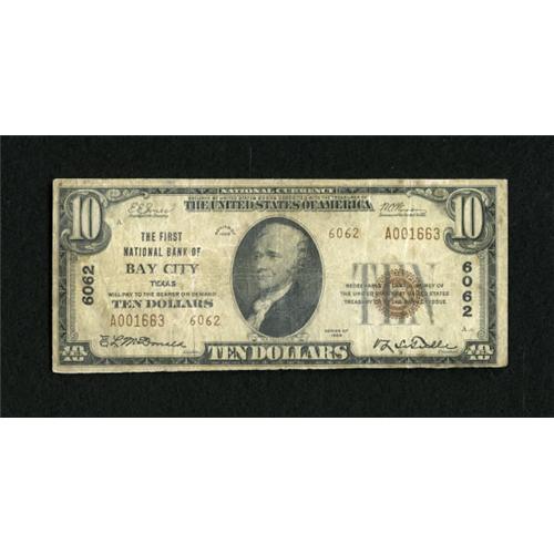 <B>Bay City, TX</B></I> - $10 1929 Ty. 2 <B>The First NB</B></I> Ch. # 6062<BR> This is only the second example for the type from this institution. <B>Very Good</B></I>, with E.L. McDonald and V.L. LeTulle sign as the officers.<BR><BR><b>Shipping:</b> Coins & Currency (<a target="_blank" href="http://www.heritageauctions.com/common/shipping.php">view shipping information</a>)