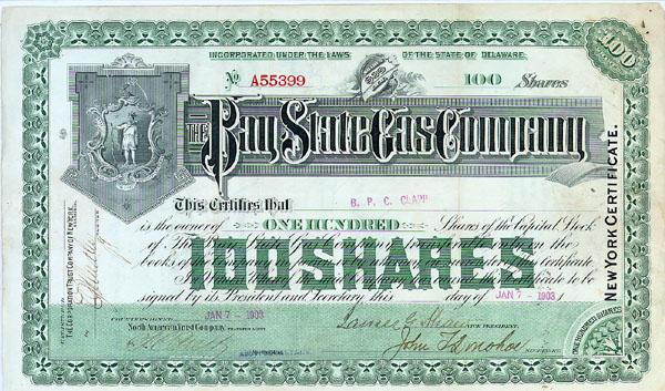 1903, Delaware. Stock certificate for 100 shares. Green/Black. Vignette at top left of Massachusetts state seal. Uncancelled and very fine.