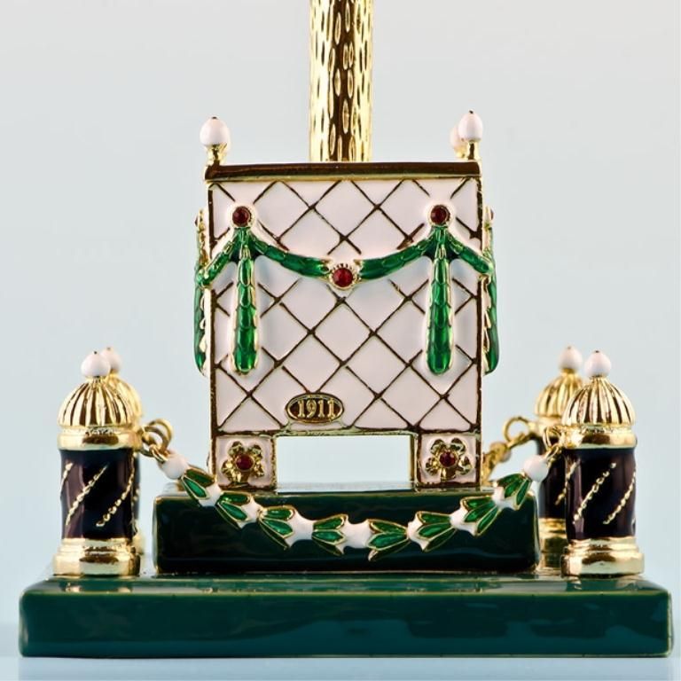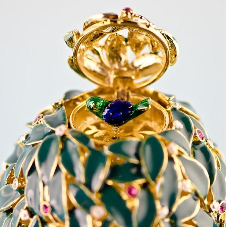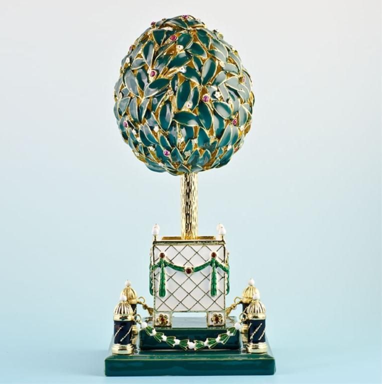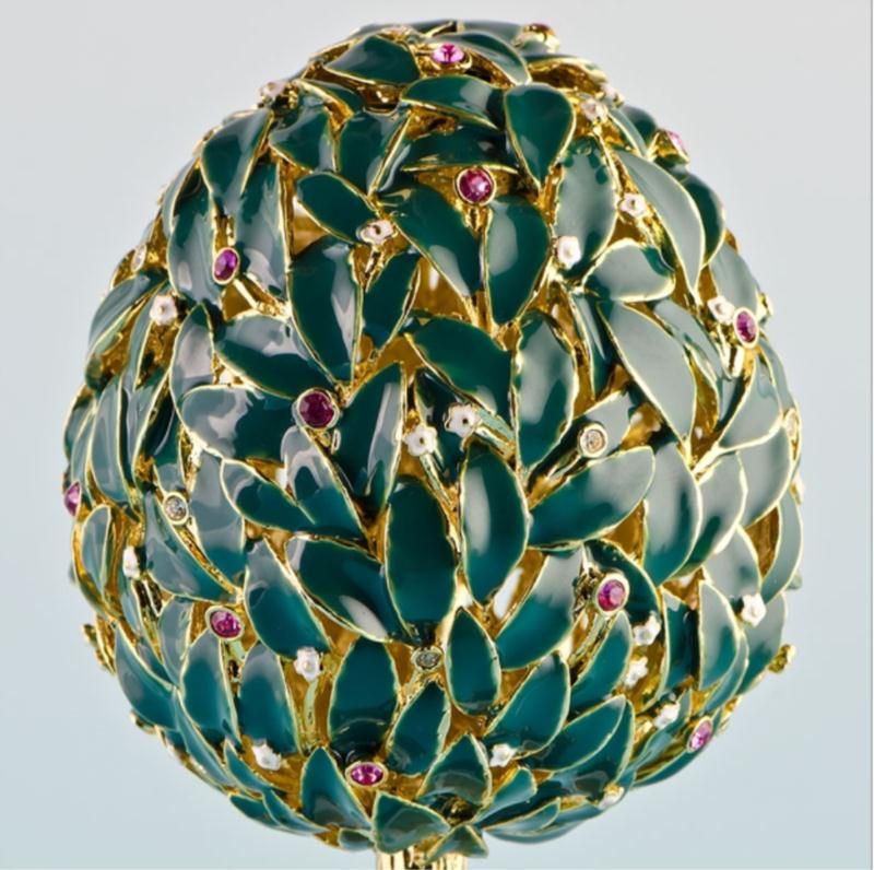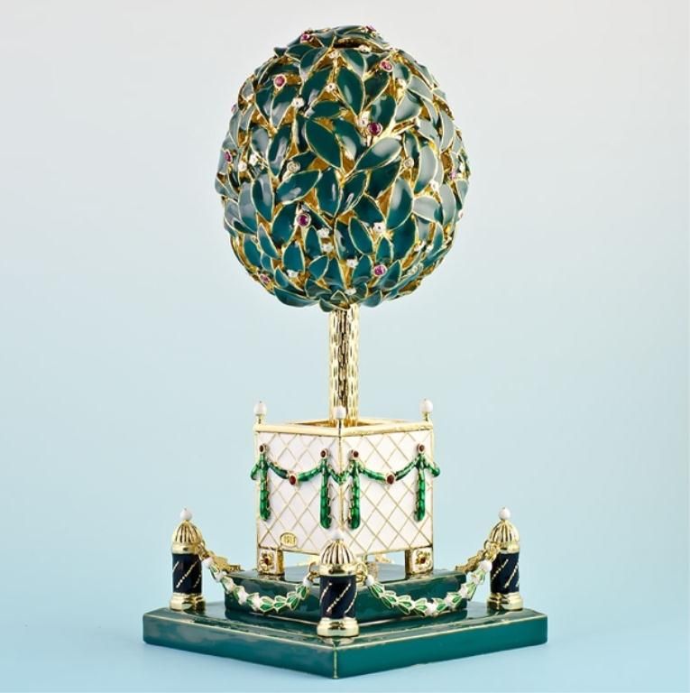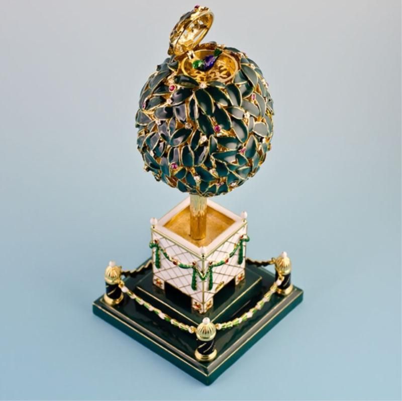 The Bay tree egg (also known as the Orange tree egg) is a jeweled carved enameled Easter egg made under the supervision of the Russian jeweler Peter Carl Faberge in 1911, for Nicholas II, Tsar of of Russia, who presented the egg to his mother, the Dowager Empress Maria Feodorovna on April 12, 1911. First known in 1935 as a Bay Tree Egg, this egg which had since 1947 been incorrectly labeled as an Orange Tree,but has recently been correctly identified as a bay tree, based on the original Faberge invoice. The egg was confiscated by the Provisional Government in 1917 and transferred from the Anichkov Palace to the Kremlin. It was one of nine eggs sold by Antikvariat to Emanuel Snowman of Wartski around 1927. It has since passed through the hands of five different owners and was sold by Mrs.Mildred Kaplan to Malcolm Forbes in 1965 for $35,000, equivalent to $212,634 at the time of the 2004 sale of the Forbes Collection to Viktor