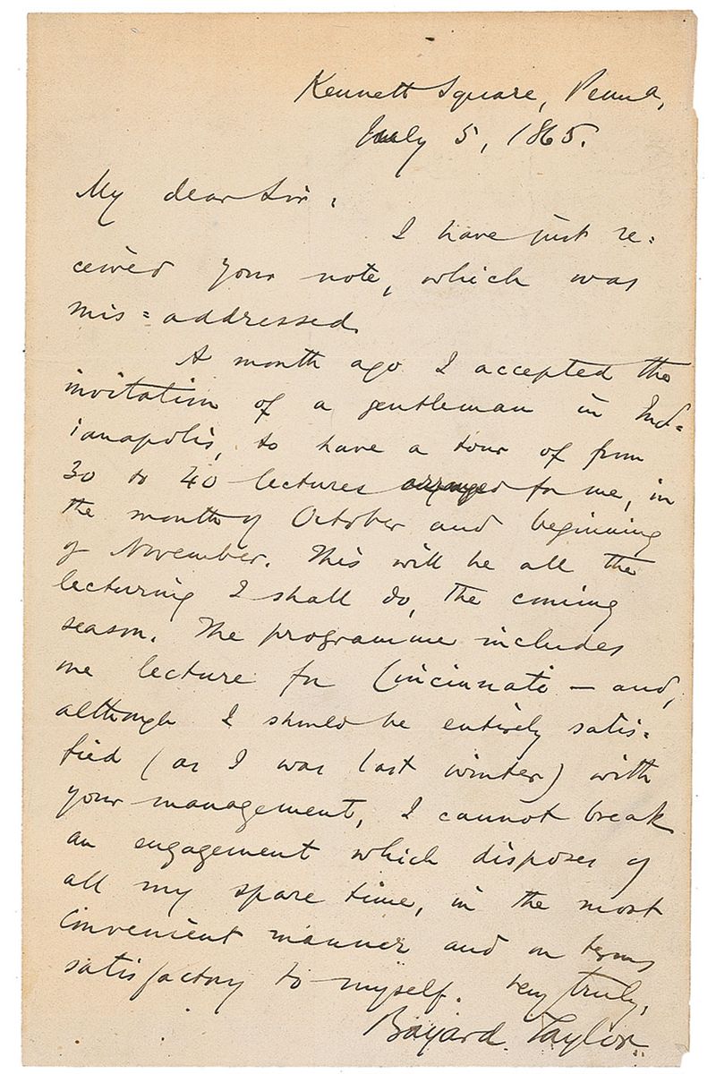 American poet, literary critic, translator, and travel author (1825–1878) who is probably best known for his translation of Goethe’s Faust. ALS, one page, 5 x 8, July 5, 1865. Letter to a gentleman. In part: “I accepted the invitation of a gentleman in Minneapolis, to have a tour of from 30 to 40 lectures arranged for me, in the month of October and beginning of November. This will be all the lecturing I shall do, the coming season.” In fine condition.