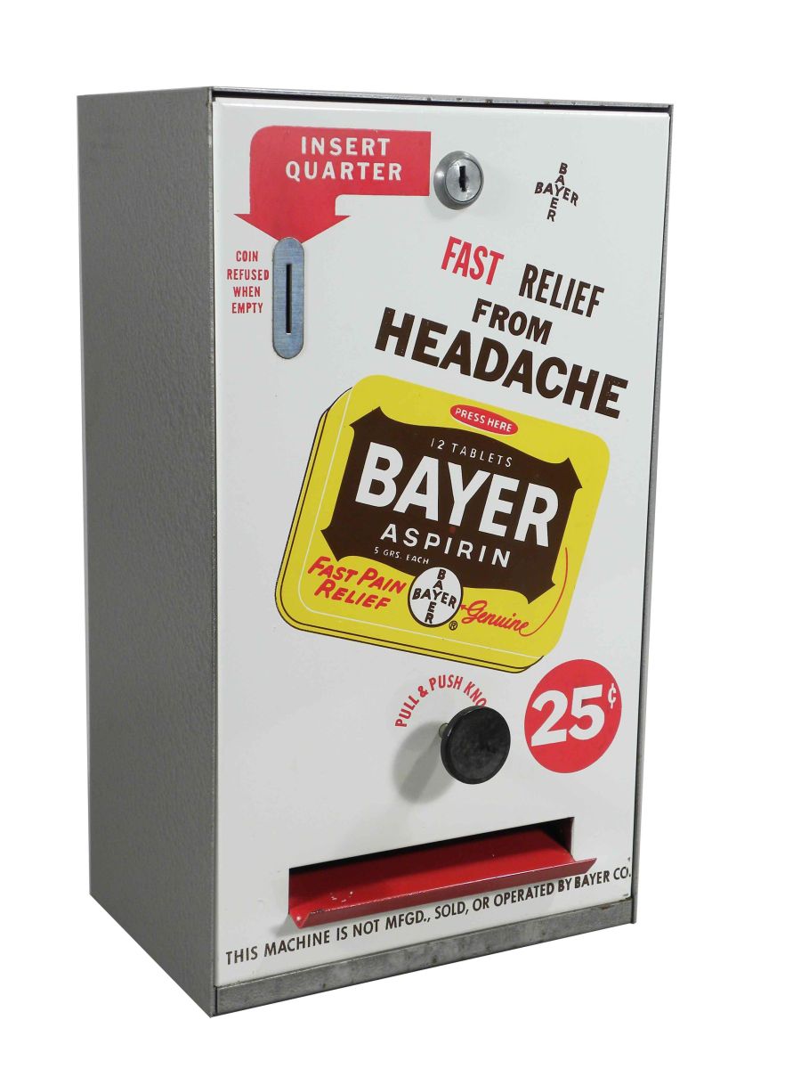 Bayer Aspirin Vendor, coin operated 25 cents. Near mint working condition, comes with key. 8 X 14 X 6 1/2inches.