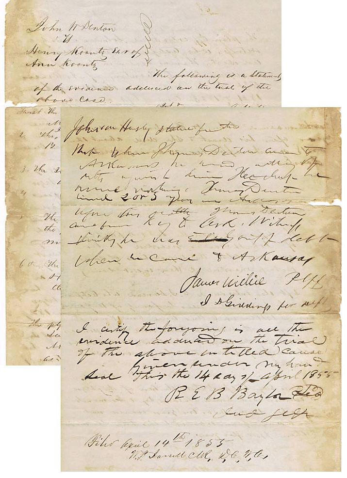 1855 Texas document signed by Justice Robert Emmett Bledsoe Baylor. Document concerns legal dispute over slave ownership and lists values, ranging from $250 to $1,475 for eight slaves. Signed at conclusion ''R.E.B. Baylor''. Four-page handwritten document, dated 14 April 1855, measures 8'' x 12''. Soiling, chipping and separation at folds. Overall, good condition.
