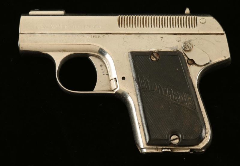 'Self-Loading Pistol' Vintage Belgium made semi-automatic pocket pistol chambered in .32 ACP. Features a nickel plated refinish, 2.25" barrel, fixed sights, manual safety, smooth trigger, detachable magazine, and two-piece checkered black hard rubber grips with BAYNARD decor. Serial match on the frame & slide and the both bare a military acceptance eagle proof mark. Pistol retains the majority of it's nickel plated finish numerous handling marks/scratches. Action is strong, bore is fair with scattered pitting and grips are near good with several cracks. Condition is good as refinished. ***C&R Firearm***