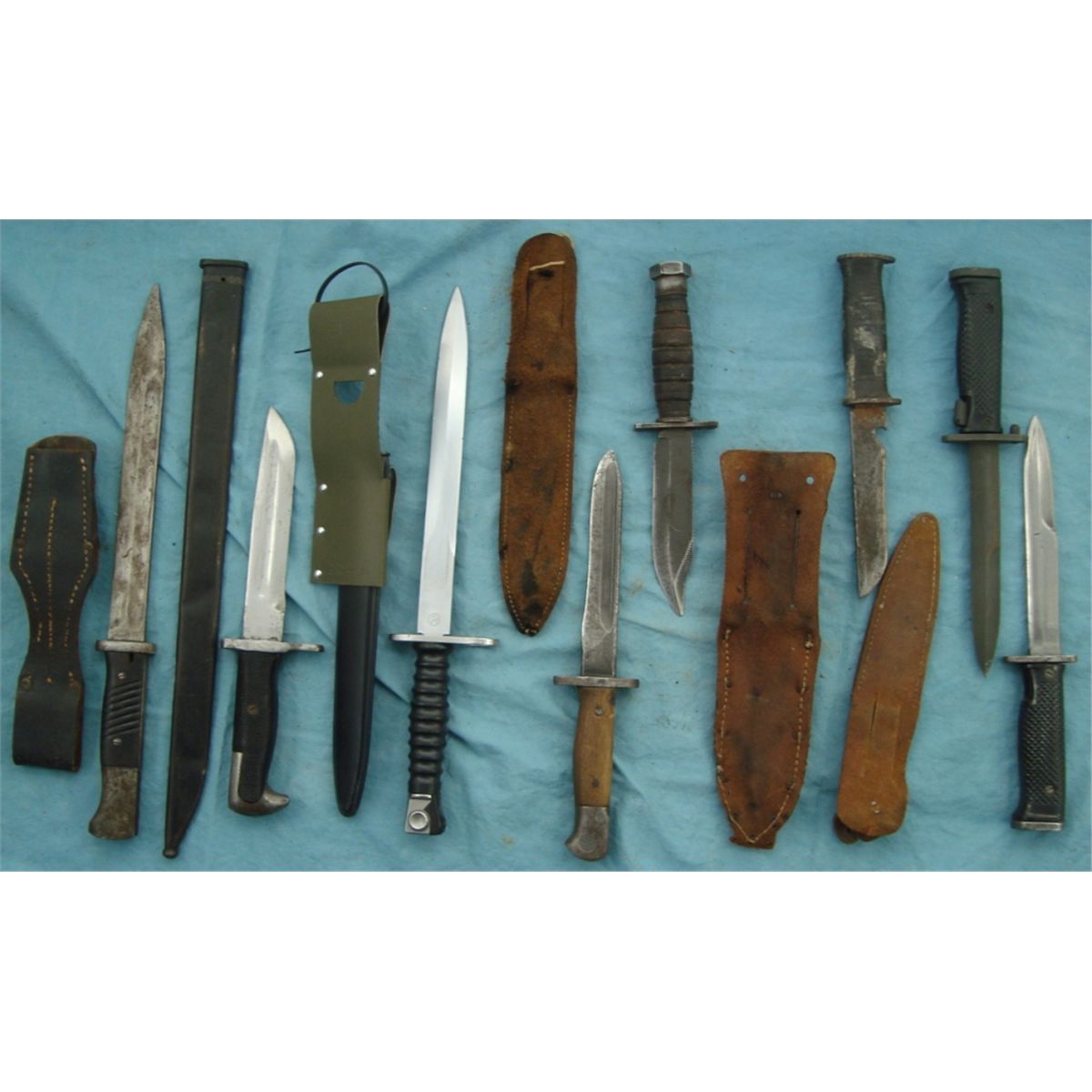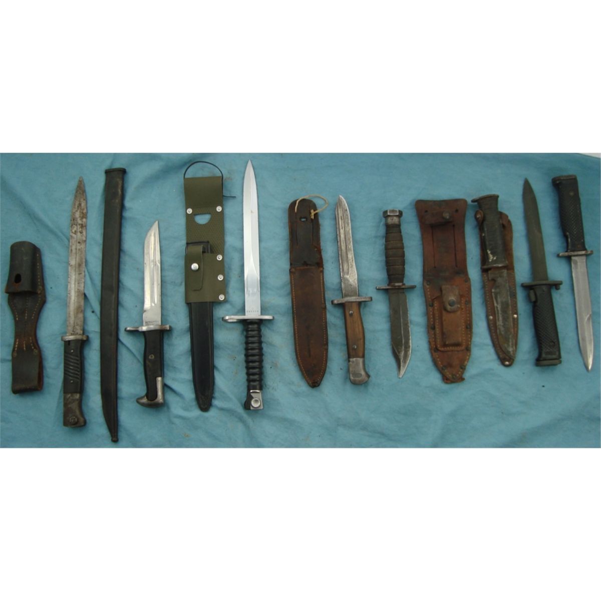 German K98; Swiss Bayonet; US M-6 & M5 A-1; 1973 Pilot Survival; 3 fighting knives & Japanese scabbard