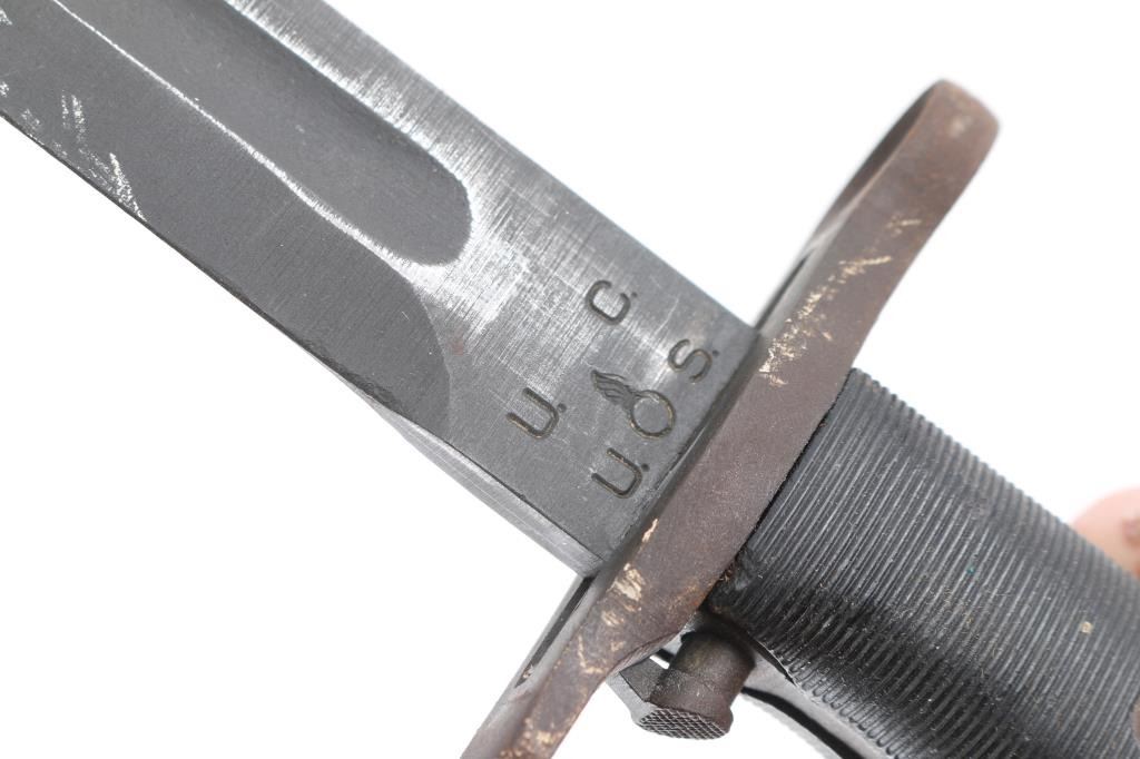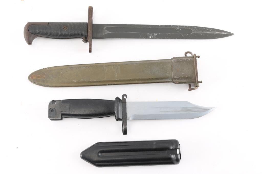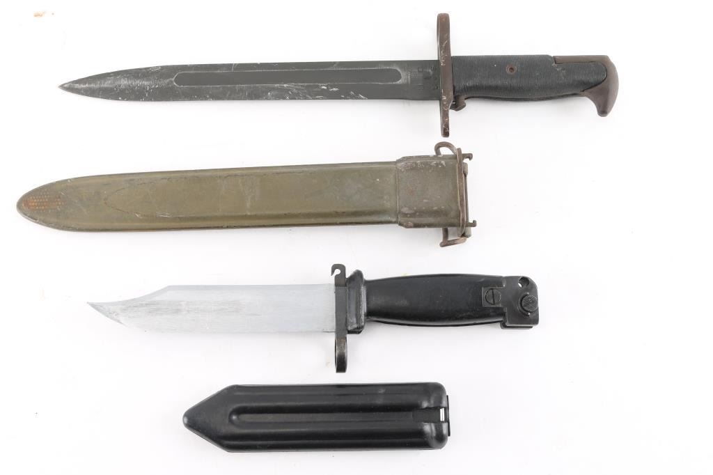 Two bayonets. 1 - US M1 Garand, marked "U.C." & "U.S." with flaming bomb on left side of Riccaso, retains majority of parkerized finish on 10" false blade, some rust on guard and pommel, comes a with "U.S" marked olive drab sheath, in good condition; 1 - Chinese Type II AK-47 with a 6" false blade, comes with black plastic sheath, in very good condition.