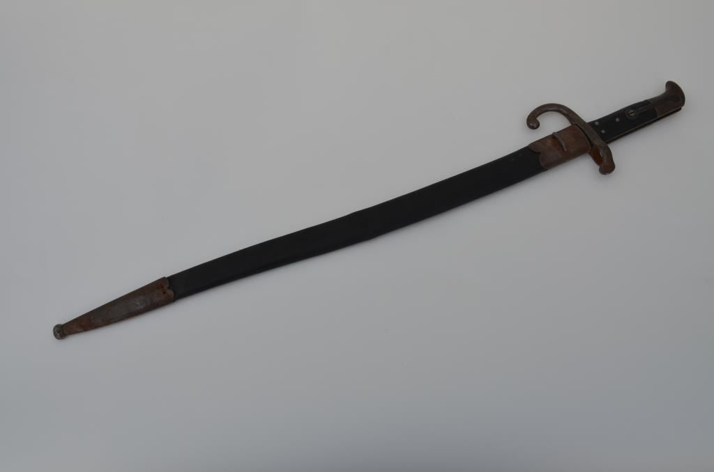 Bayonet and leather scabbard, approx. 27” overall with a 22” blade in fair to good condition; blade has some scattered surface rust that should clean; scabbard shows loss of stitching, metal throat and drag present;blade is maker marked “WEYERSPER, SOLINGEN”. Est.: $100-$200.