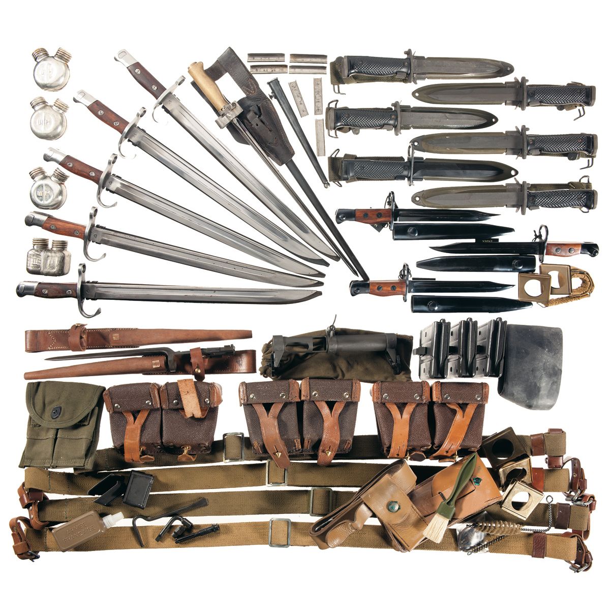 13 3/4" spike bayonet with scabbard, French Model 1936/51 rifle manual dated 1969, U.S. M6 bayonet with Germany marked M8A1 scabbard, 2 U.S. M5 bayonets with scabbards, U.S. M5-1 bayonet with scabbard, 2 U.S.. bayonets M5A1 with scabbard, 3 made in India bayonets with scabbard, spike bayonet with 2 scabbards, 5 Japanese bayonets with scabbards, canvas dual magazine pouch, 3 pebble leather dual magazine pouches, 4 Russian style military canvas slings, 4 Russian style military oilers, 2 rifle firing pins (likely Russian), slip on recoil pad, French night fighting sight, 3 rifle magazines, 19 assorted clips, French Model 1949/56 manual dated 1974 with sling, 2 tools, and 2 bore brushes.
