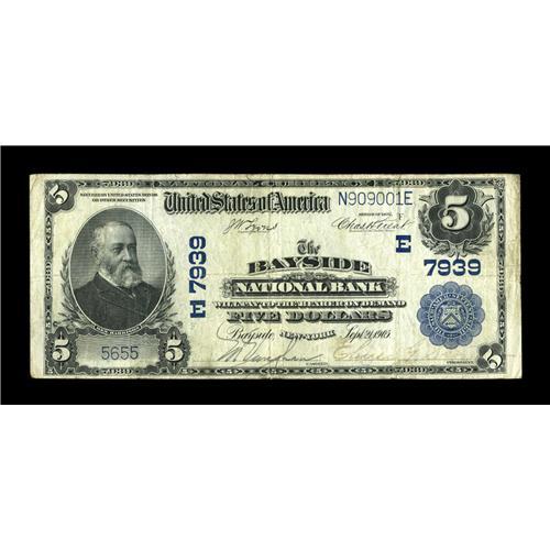 <B>Bayside, NY</B></I> - $5 1902 Plain Back Fr. 599 <B>The Bayside NB</B></I> Ch. # (E)7939<BR>A much in demand Queens County note from a bank which issued large examples only. Fewer than ten pieces make up the entire census, with the last Blue Seal offered publicly realizing $1380 in our September, 2004 sale. This specimen is a bit higher grade, and will likely bring the same or more. <B>Fine+++.</B></I><BR><BR><b>Shipping:</b> Coin/Currency (<a target="_blank" href="http://www.heritageauctions.com/common/shipping.php">view shipping information</a>)