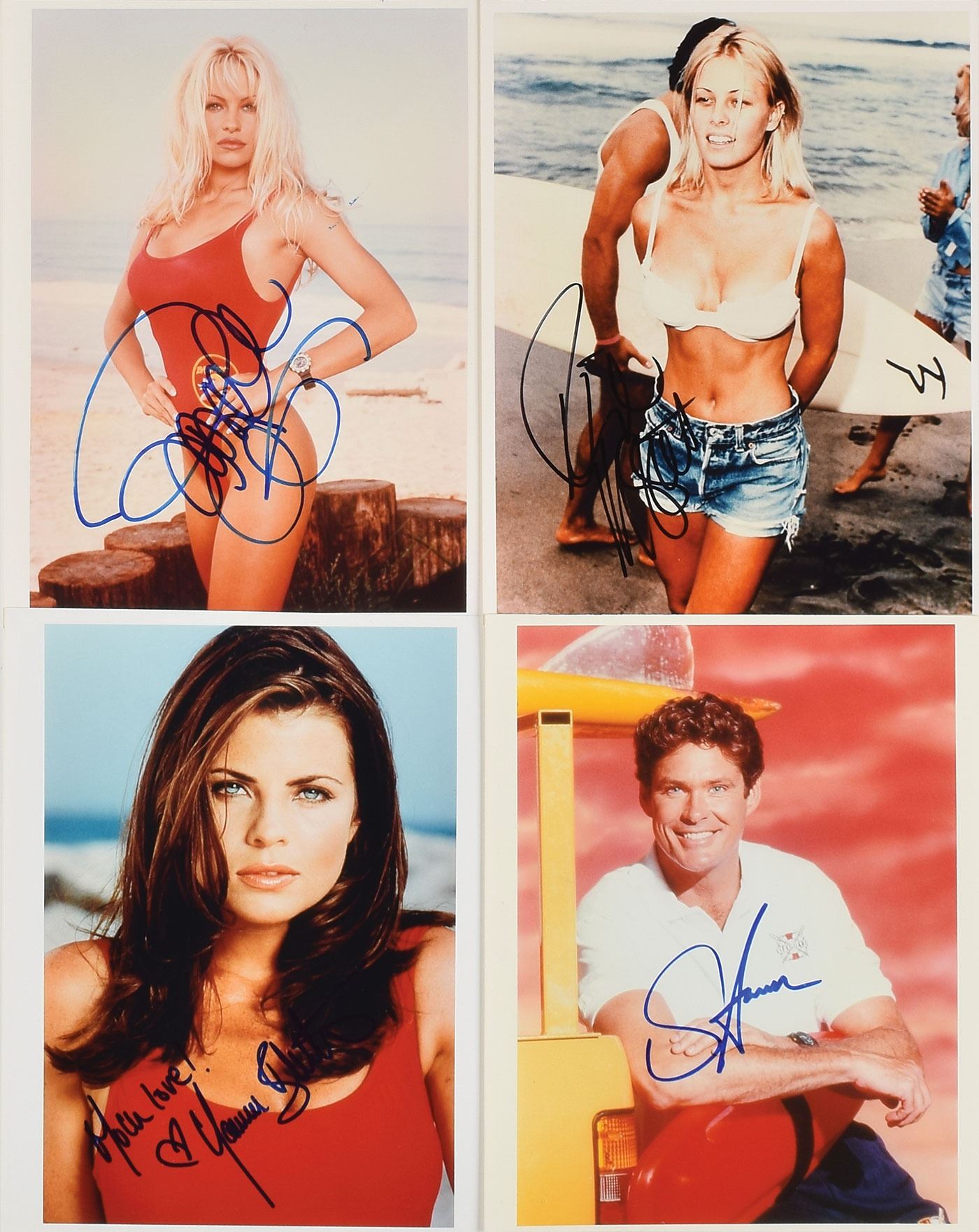 Four color glossy 8 x 10 photos of stars from the lifeguard television drama Baywatch, each signed in blue or black felt tip by the pictured actor or actress: Pamela Anderson, Yasmine Bleeth, Nicole Eggert, and David Hasselhoff. In overall fine condition.