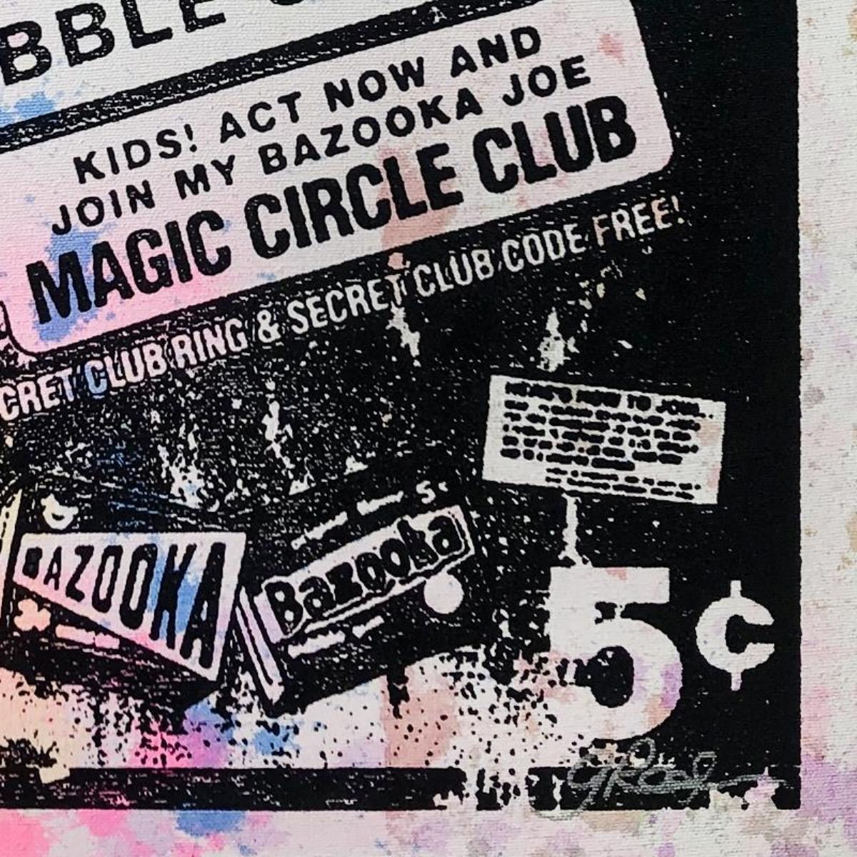 "Bazooka Joe" is an original hand pulled silkscreen and acrylic painting on canvas by Gail Rodgers. Hand signed by the artist, the piece comes with a letter of authenticity. This piece is meant to be gallery wrapped and measure approximately 23" x 23" and image dimensions (after stretching) 16" x 16" (image).