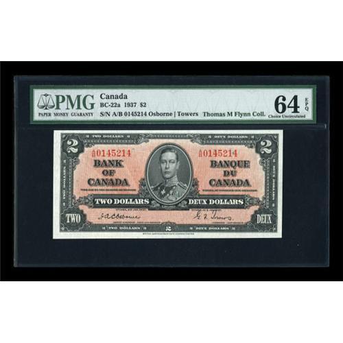 <B>BC-22a $2 1937</B></I><BR> This is by far the scarcest of the 1937 $2 issues. The Flynn collection specimen is about as nice as they come, with great color and full originality. PMG <B>Choice Uncirculated 64 EPQ.</B></I><BR><I>From The Thomas M. Flynn Collection</B></I><BR><BR><b>Shipping:</b> Coins & Currency (<a target="_blank" href="http://www.heritageauctions.com/common/shipping.php">view shipping information</a>)