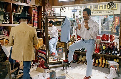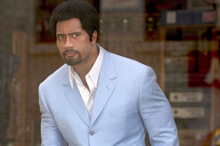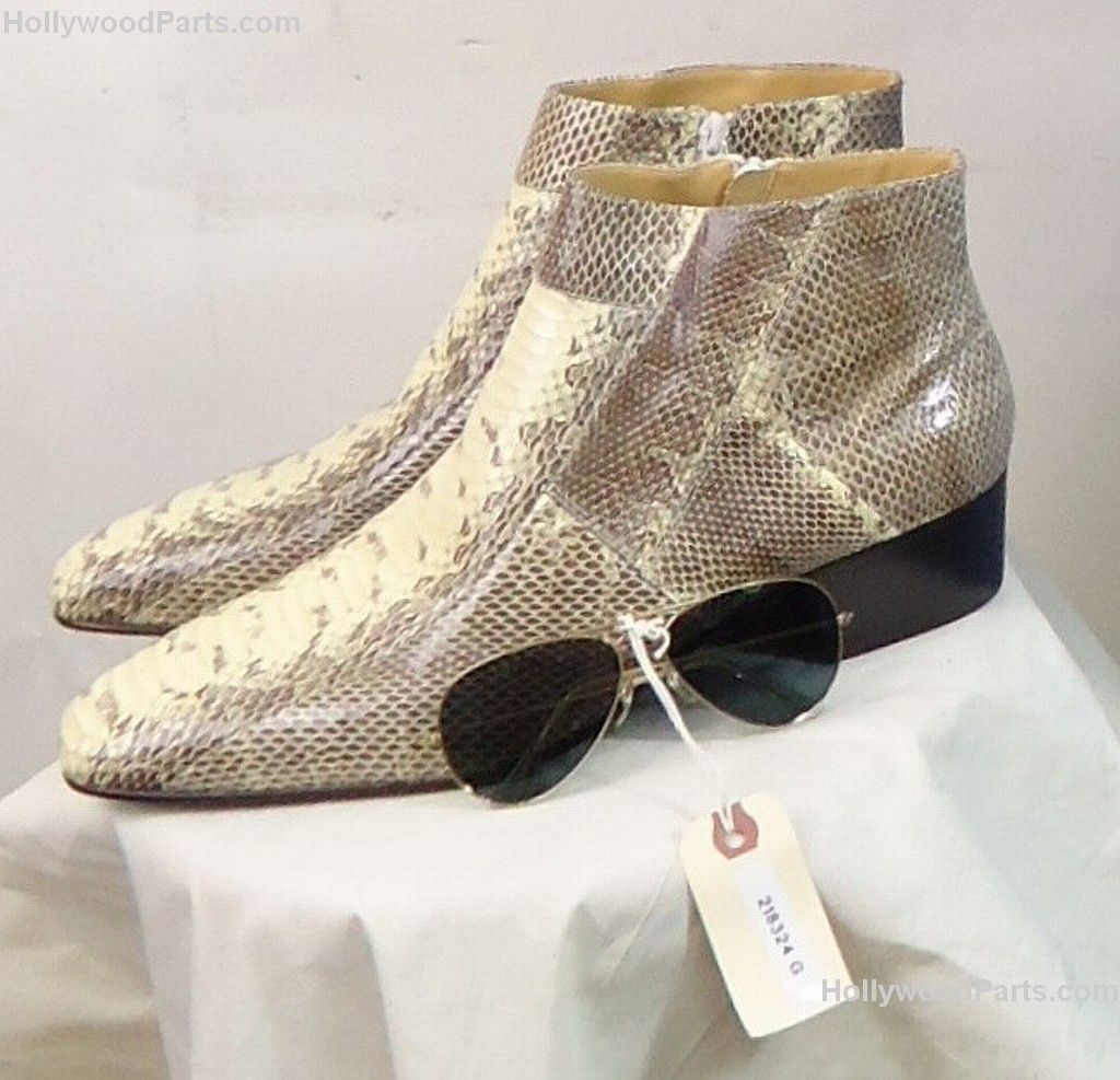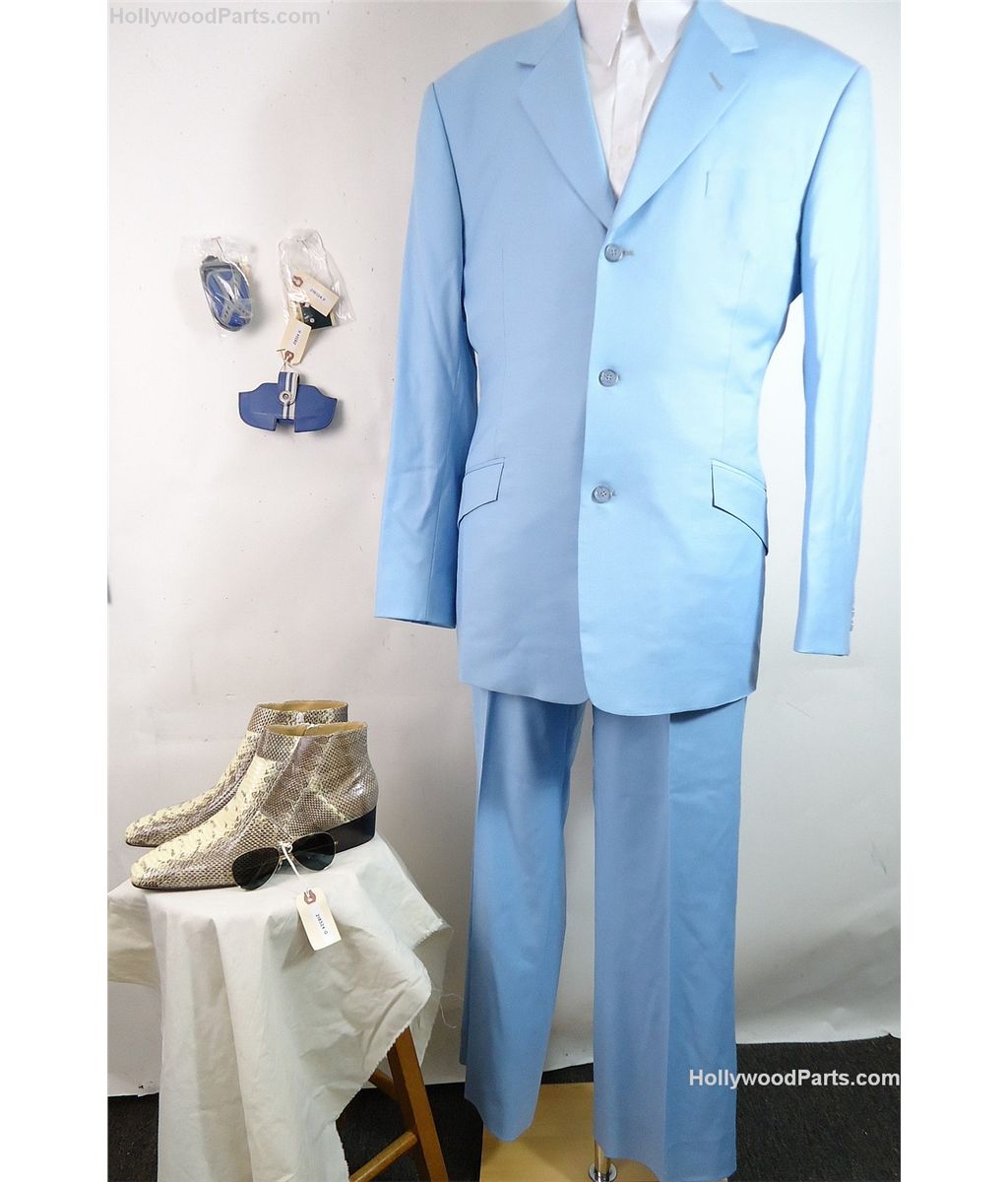 Hero outfit worn by the Rock as Elliot Wilhelm in Be Cool. Costume consists of High Society light blue sports jacket with notched lapel, matching pants with flat front, Enrico Rossini white polyester satin dress shirt size XXL, Giorgio Brutini pair of brown and cream snake skin ankle-high boots with zipper, pair of black gold toe socks. Also includes accessories; blue and white leather Sidekick phone pouch, pair of CZ stud earrings, pair of dark green Rayban sunglasses with gold wire frame. Change 3, Scene 68. Used at the Boot Barn when Elliot dances and sees Chili.