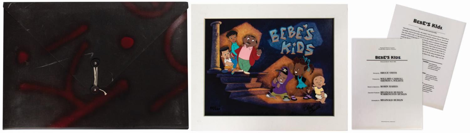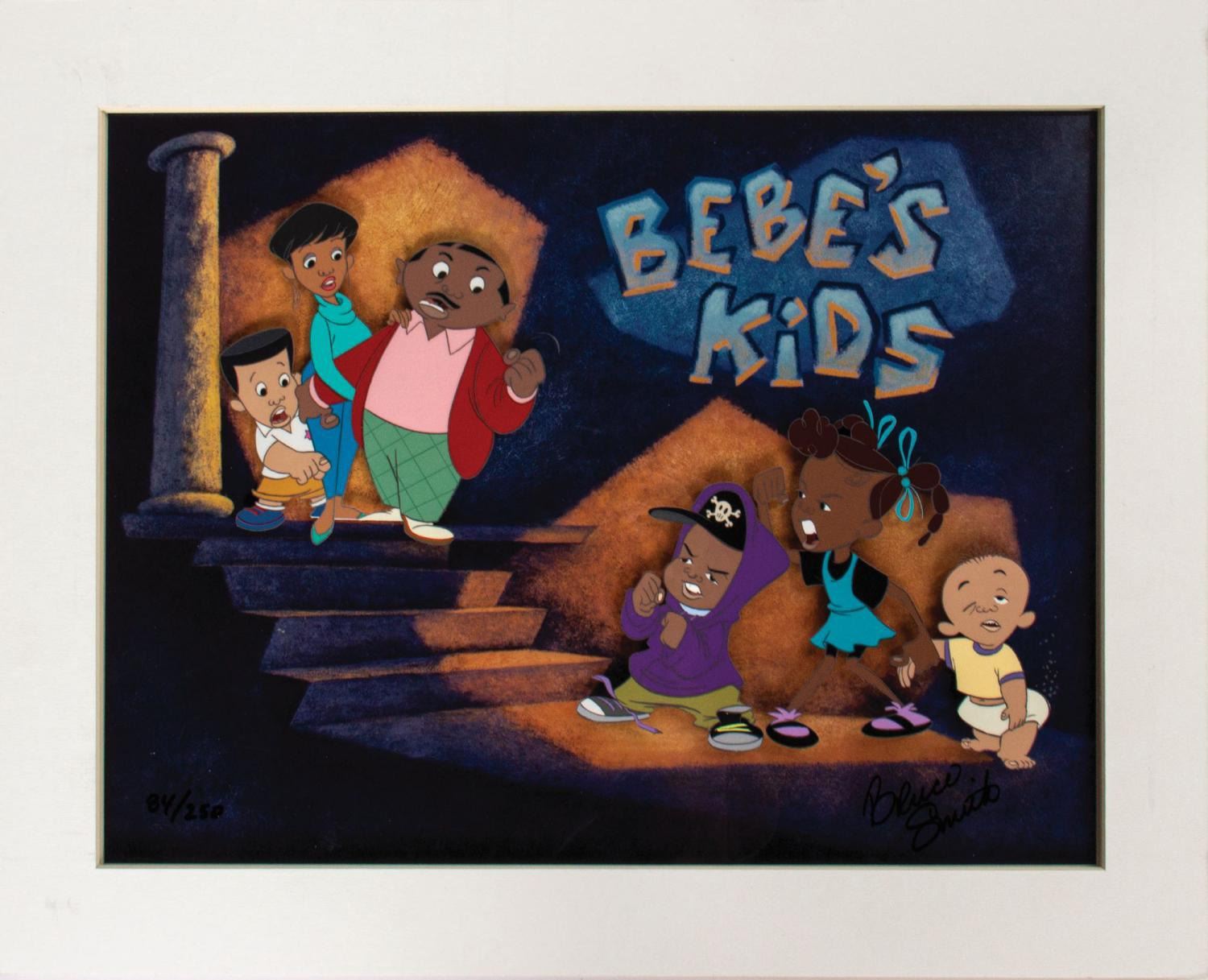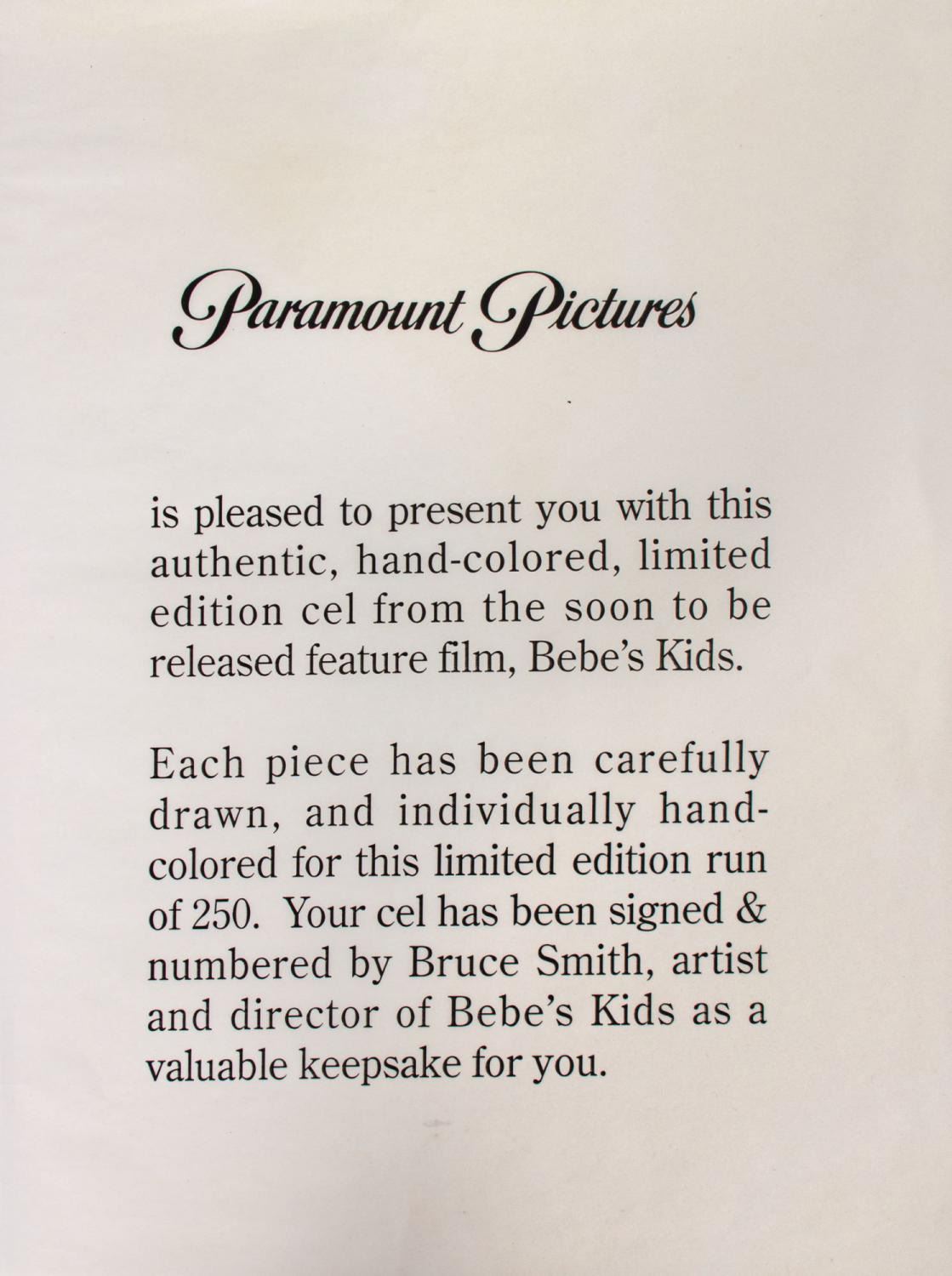 (Paramount, 1991) A promotional cel created for the animated feature film Bebe's Kids, based on the stand up comedy of Robin Harris. This cel setup comes from the collection of Bill Wallen, who helped create promotional and advertising campaigns for the film. The cel is matted in three separate layers and includes a reproduction background. The setup comes with several sheets of information about the film. The top cel has been hand-numbered 84/250, and is signed by director Bruce Smith at the lower right. Measuring 10.25"x14.75" in the 14"x18" mat, the cel is in very good condition with a small scuff at the upper right of the top cel, and minor wear to the mats. The cel setup comes in a 14.75"x20.5" folder, which has a few spots of surface wear on the front.