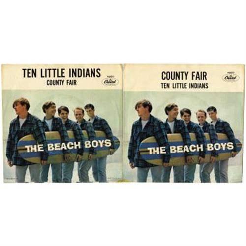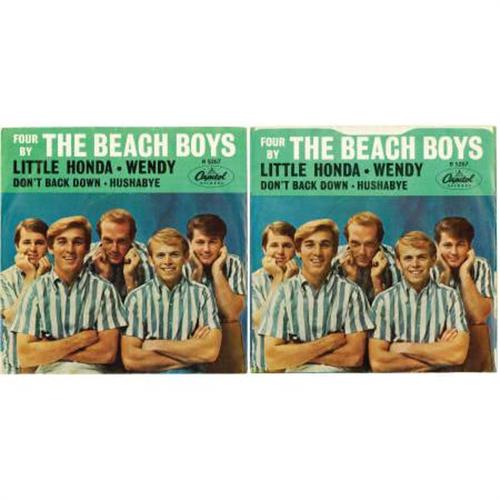 <B>Beach Boys 45s/Picture Sleeve and EP Group (Capitol, 1962-66).</B></I> Three great picture sleeves of the Boys, including their two, "Surfin' Safari"/ "409" (4777, 1962) in EX 7/ VG-EX 6, and "Ten Little Indians"/ "County Fair" (4880, 1962) in EX 7/ NM 8. Original member David Marks is in both of these early pics. The third sleeve included here is for the 1966 EP "Four by The Beach Boys" and includes the songs "Little Honda"/ "Wendy"/ "Don't Back Down"/ and "Hushabye". Condition: EX 7/ VG-EX 6 (small tear on label, otherwise NM 8). <I>Accompanied by LOA from PSA/DNA.</B></I><BR><BR><b>Shipping:</b> Recordings (<a target="_blank" href="http://www.heritageauctions.com/common/shipping.php">view shipping information</a>)