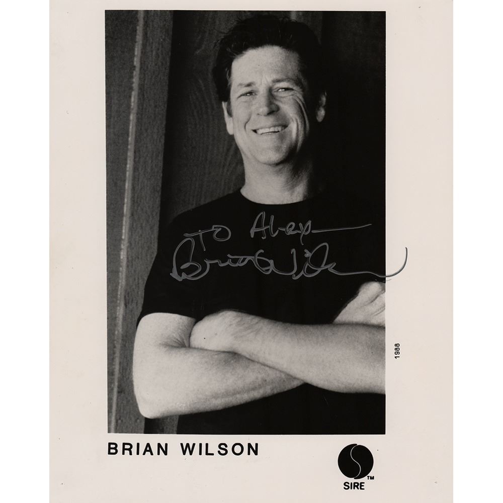 Circa 1988 satin-finish 8 x 10 Sire Records publicity photo of Wilson smiling with his arms folded, signed and inscribed in silver ink, "To Alex, Brian Wilson.” In fine condition, with tack holes to corners. The consignor notes that the autographs were obtained by a person who worked for various record companies in the 1980s and 1990s and who gained access to groups at numerous concerts. Accompanied by a certificate of authenticity from Tracks.