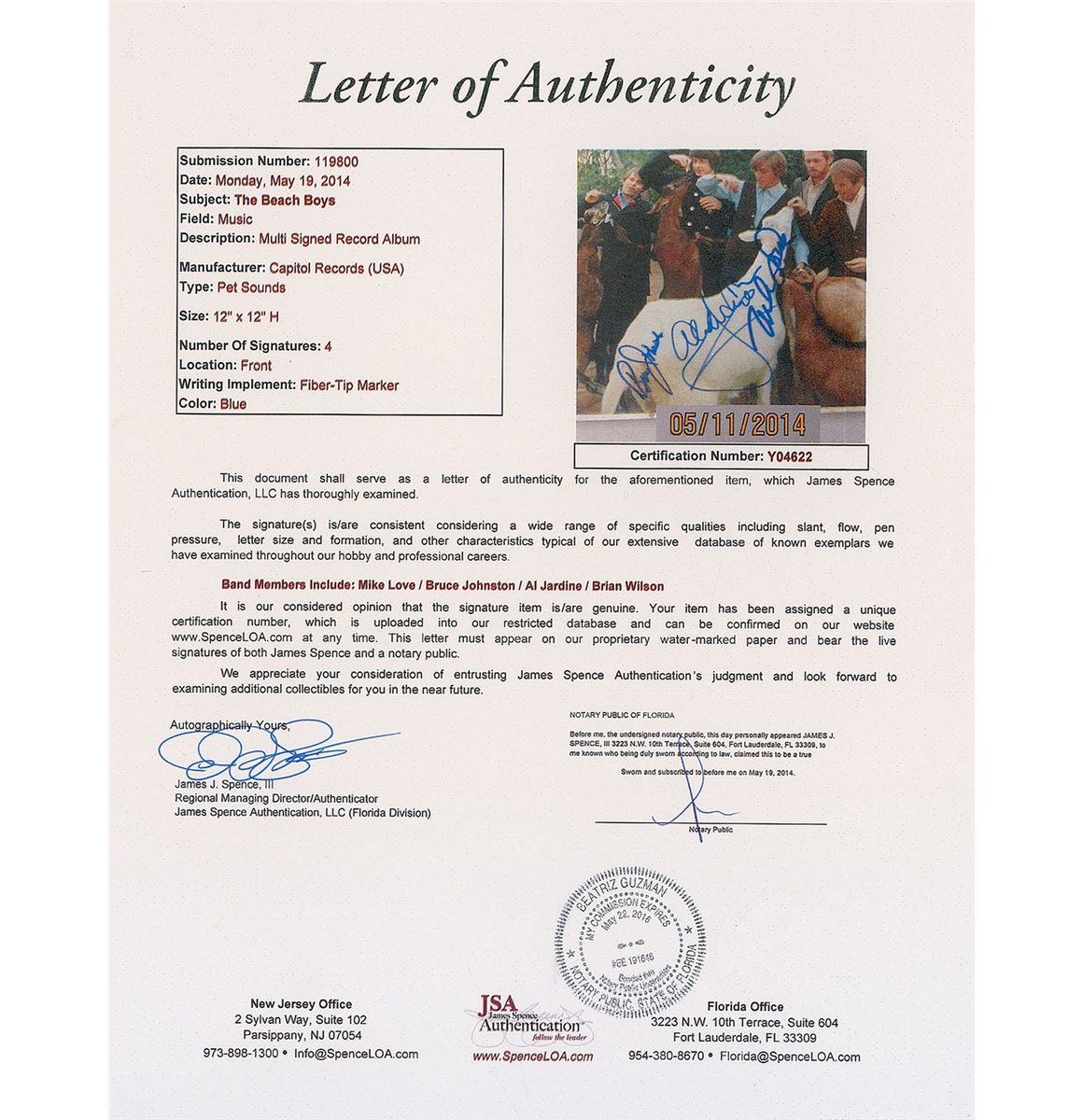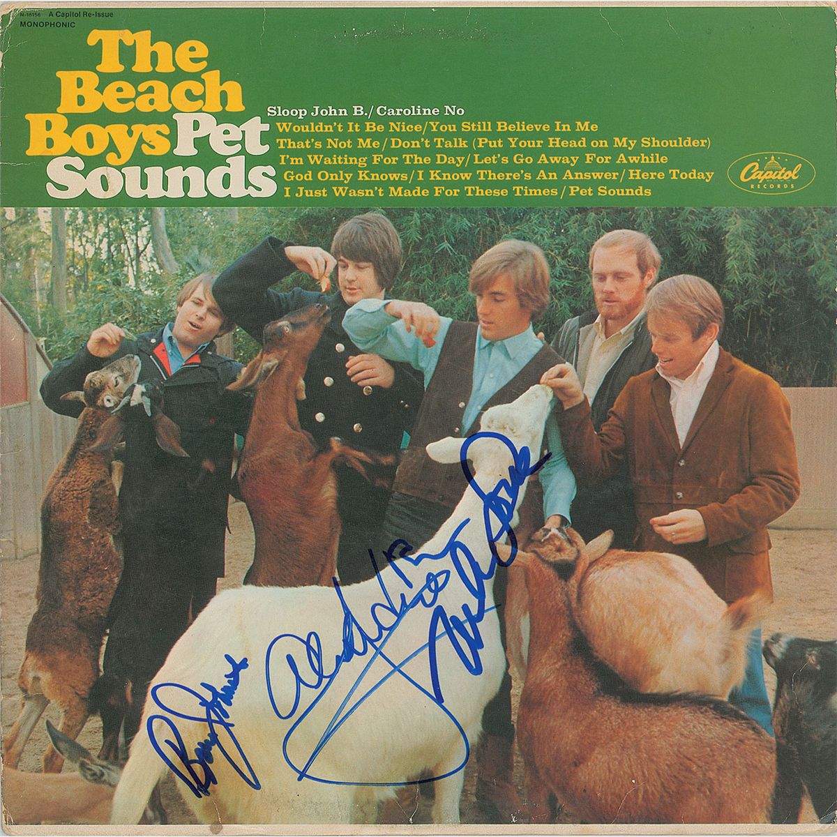 Pet Sounds album signed on the front cover in blue felt tip by Brian Wilson, Mike Love, Bruce Johnston, and Al Jardine. In fine condition, with various creases to edges and a JSA label affixed to the reverse. Accompanied by a full letter of authenticity from JSA. The record is included.